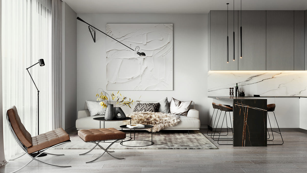 Дизайн лобби продолжает стилистику фасадов: минимализм, светлые тона, натуральные материалы и большое количество света.