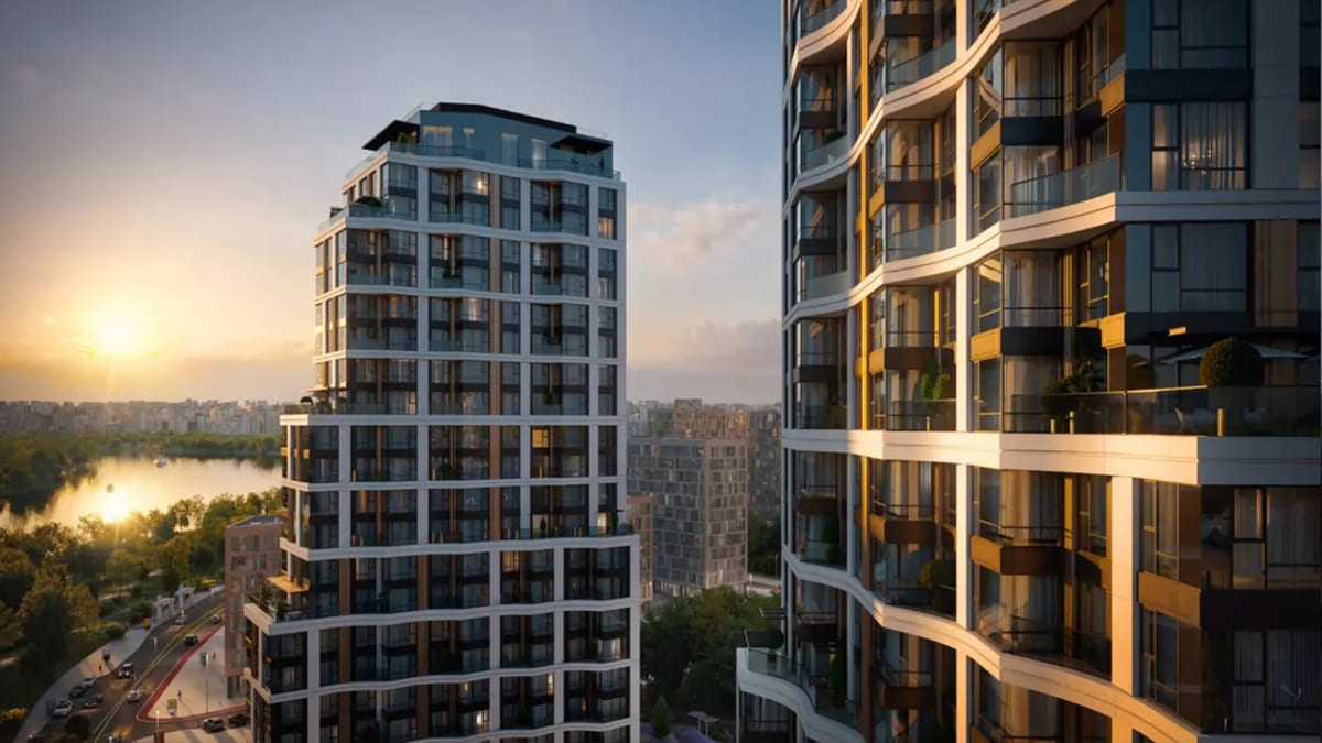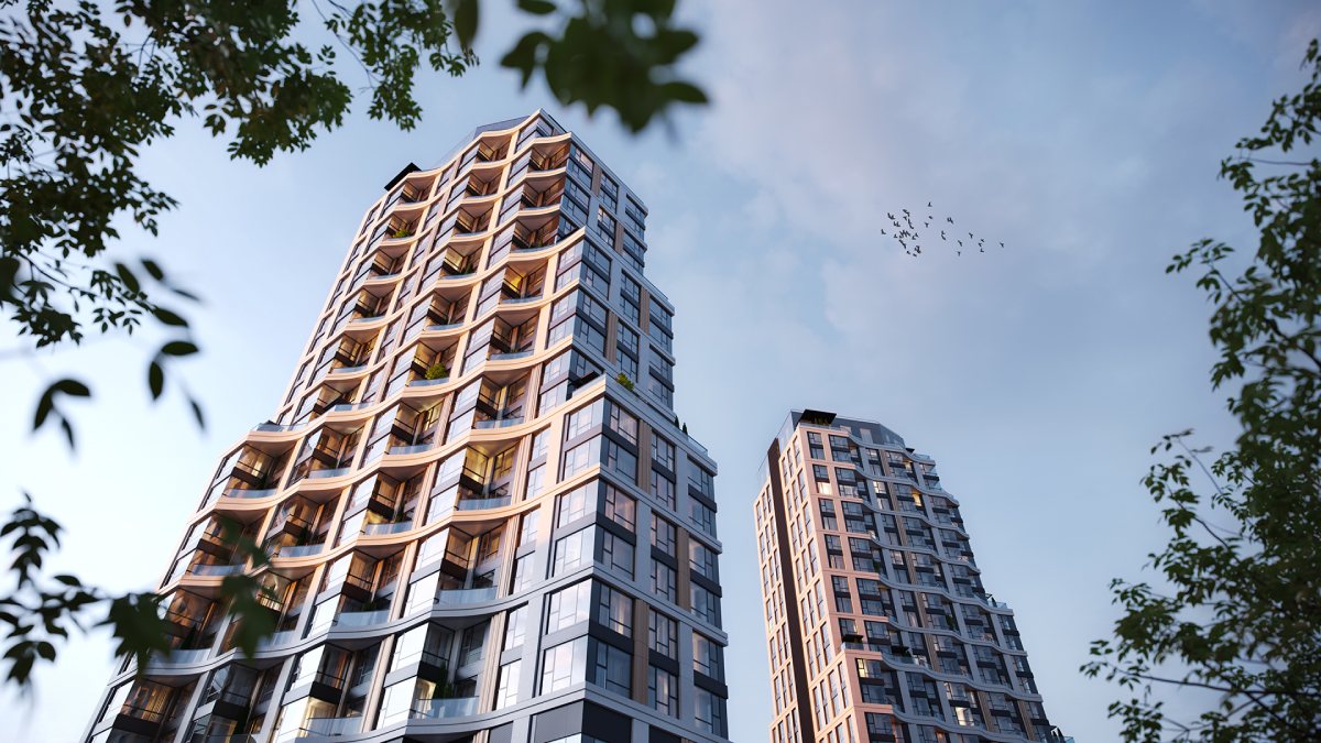 Проект разработан международным архитектурным бюро ATRIUM. В основе композиции – выразительные треугольные волнообразные башни с видовыми террасами, которые задают узнаваемый ритм и открывают виды на воду и парки.