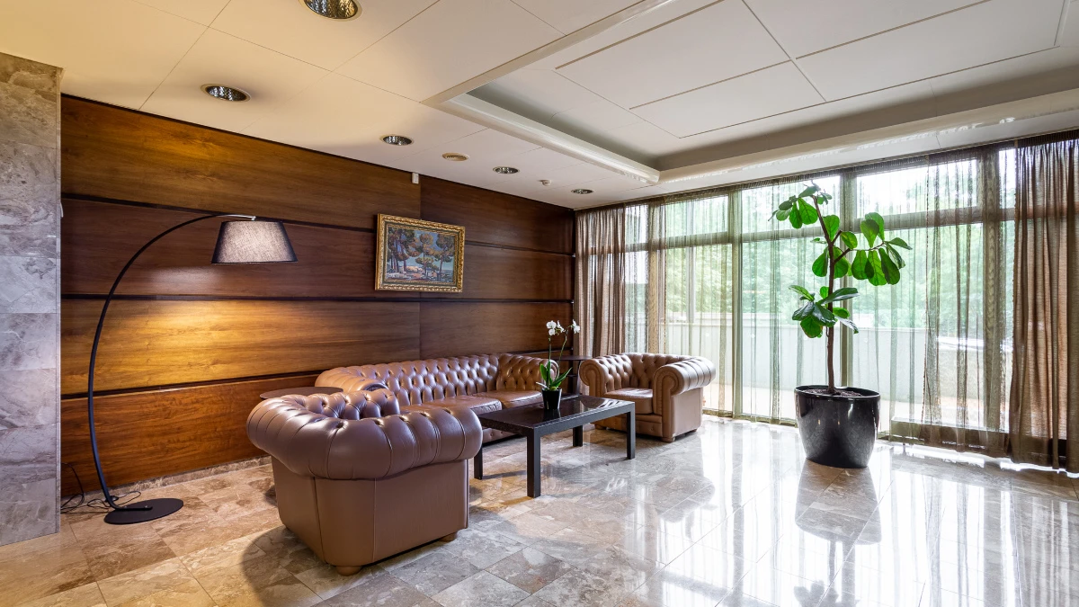 На первом этаже дома расположено просторное гранд-лобби в классическом стиле. Отделка натуральным мрамором и деревом, мягкая мебель и работа консьержа создают атмосферу уюта и респектабельности с первых минут.