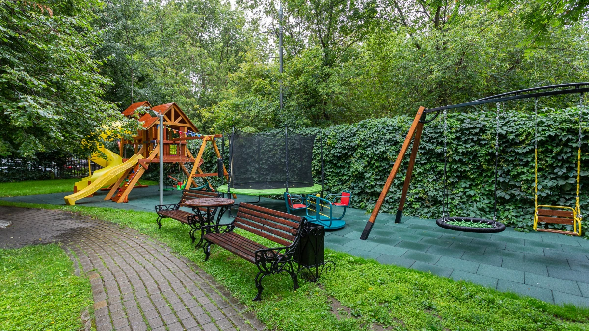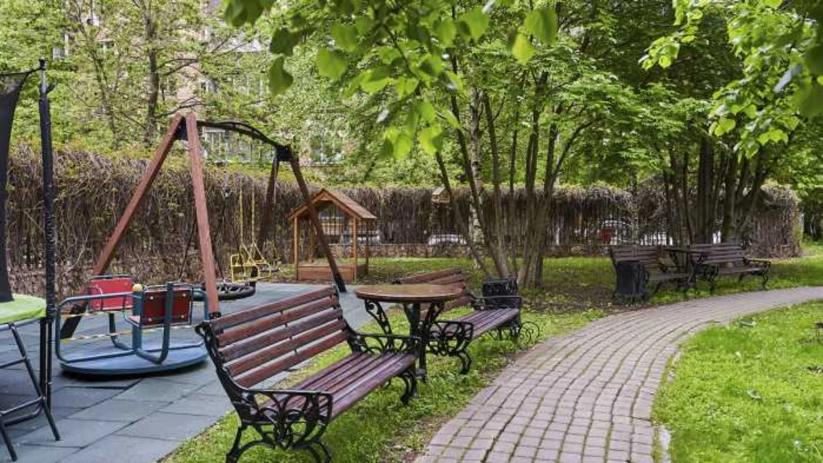 Придомовая территория комплекса площадью 0,8 гектар спроектирована как приватное пространство для отдыха: высажены деревья и кустарники, оформлены клумбы, оборудованы зоны с теневыми навесами и современная детская площадка.