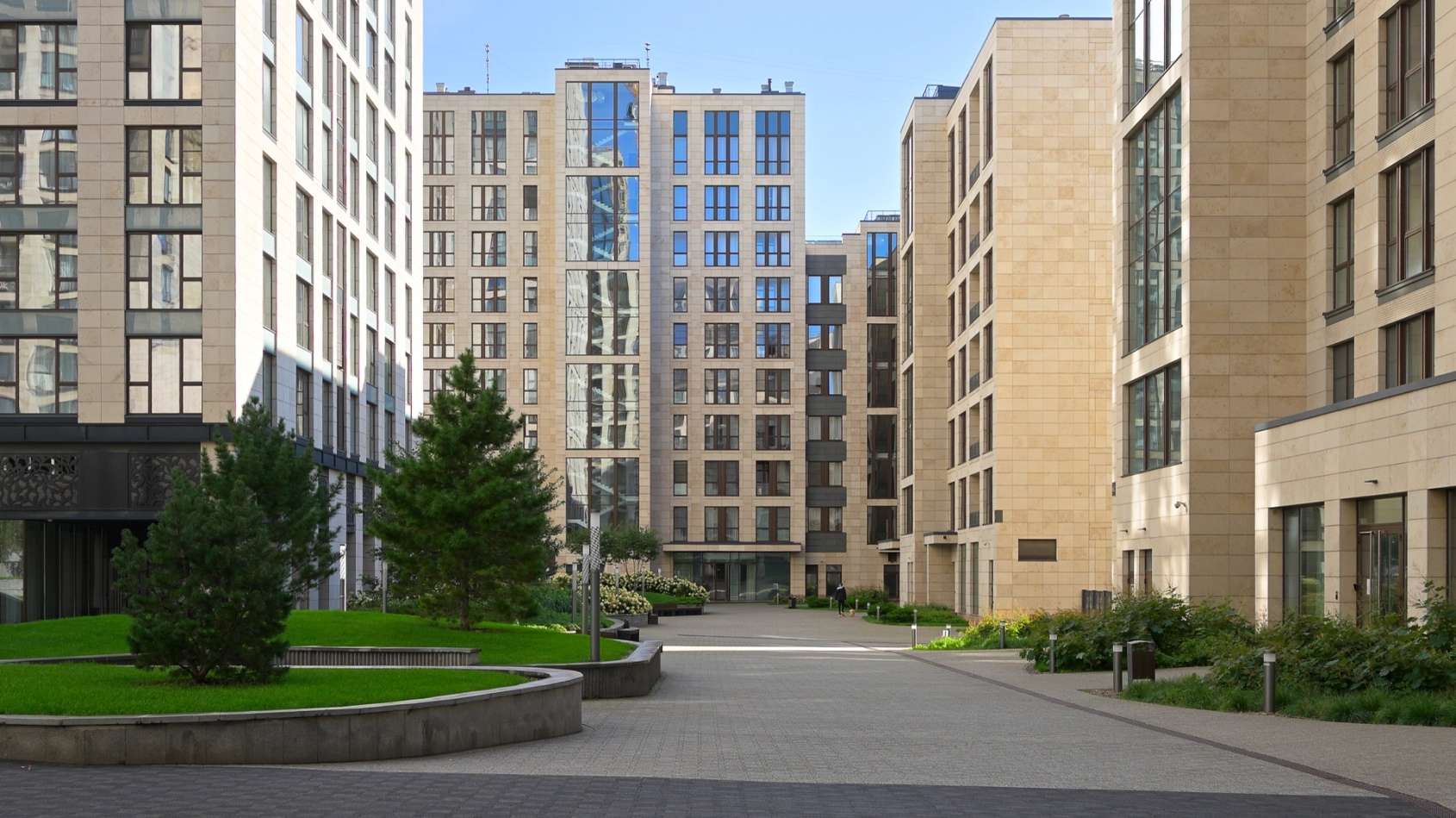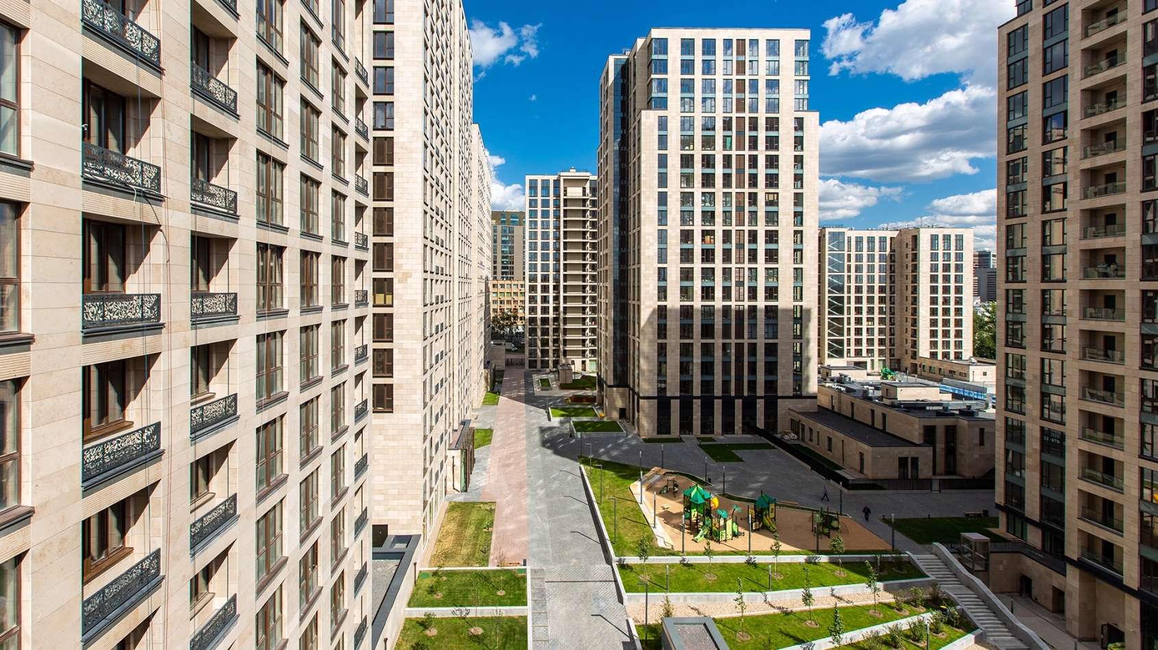 Переменная этажность корпусов позволяет солнечному свету свободно проникать во внутренний двор, делая его светлым и уютным. Панорамное остекление и ажурные балконы не только добавляют зданиям легкости, но и открывают жителям впечатляющие виды на деловой центр Москвы и окружающие парки. Этот проект демонстрирует гармоничное сочетание классической эстетики и современных технологий в строительстве.