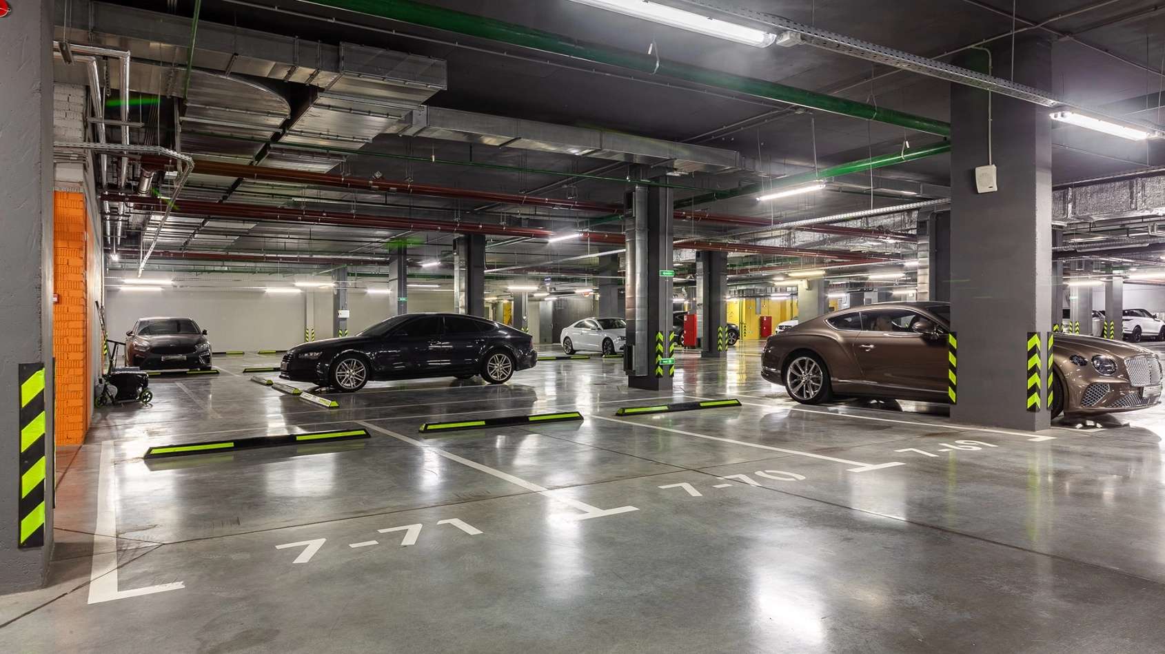 Для автомобилистов предусмотрен двухуровневый подземный паркинг, оснащенный лифтами, напрямую выходящими в жилые секции. На поверхности также есть гостевые парковочные места. Инженерное оснащение включает автономную котельную, систему центрального кондиционирования и вентиляции, а также резервное энергоснабжение, гарантирующее бесперебойную работу всех систем.