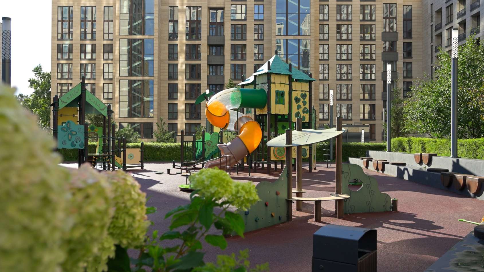 Для активного отдыха жителей всех возрастов оборудованы современные спортивные и воркаут-площадки, а для детей — безопасные игровые зоны. В теплое время года можно отдохнуть в тени деревьев или провести время в специально обустроенных зонах отдыха. Авторское ландшафтное освещение делает двор не менее привлекательным и уютным в вечернее время.