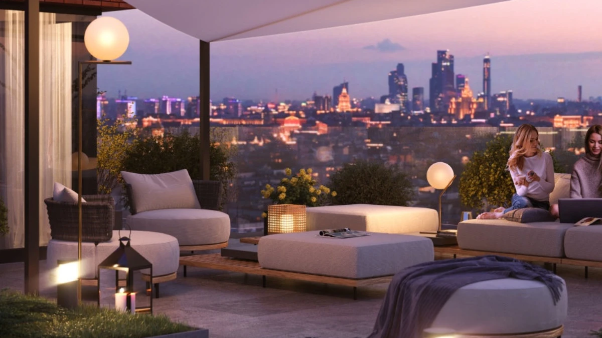 Главным акцентом становится просторная терраса площадью 1000 м², которая превращает двор в настоящий оазис уюта в центре мегаполиса. Это место, где можно отдохнуть после насыщенного дня, провести время с семьёй или насладиться тишиной.