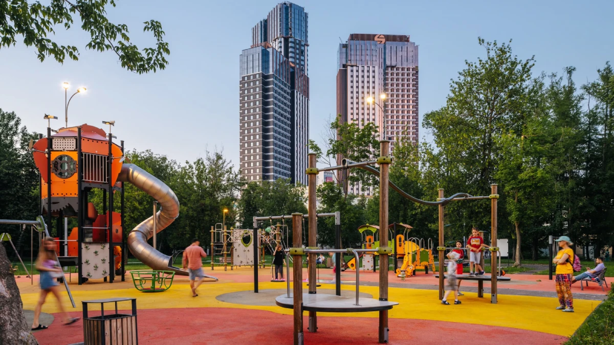 Внутренний двор ЖК «Режиссёр» – это приватная закрытая территория с зонами отдыха, детскими площадками и уютными уголками для прогулок. Здесь есть зоны с подвесными качелями, шезлонгами и воркаут-зона для активных жителей.