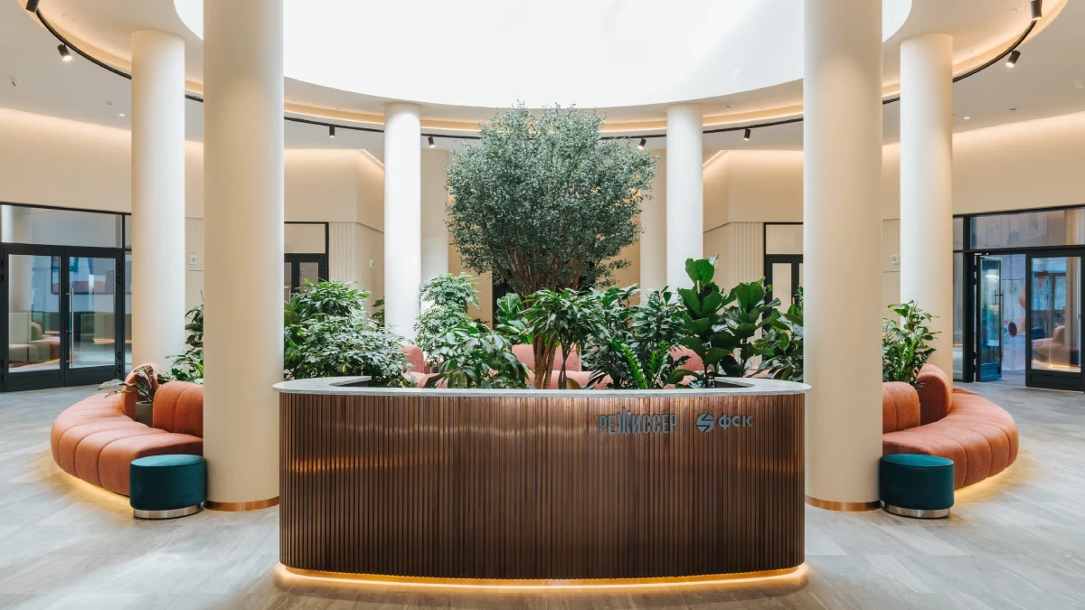 Проект входных групп жилого комплекса «Режиссёр», созданный архитектурным бюро Haast, объединяет три башни общим современным вестибюлем с монументальными скульптурными формами. Центральное пространство оформлено зимним садом с гипоаллергенными растениями и уникальной зелёной зоной ожидания под витражом, создающей кинематографичный эффект присутствия одновременно внутри и снаружи.