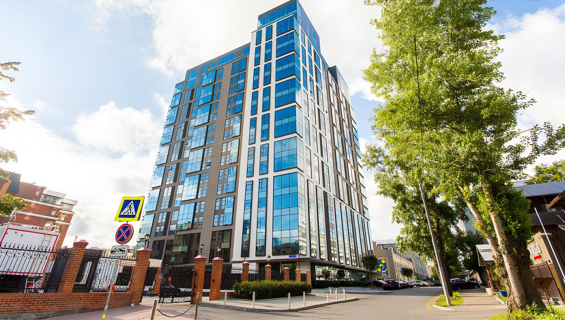 Проект включает 164 квартиры, а на верхних этажах расположены эксклюзивные пентхаусы площадью до 291 кв. м с собственными террасами. Здание имеет закрытый двор без машин, где разбиты природные зоны отдыха.