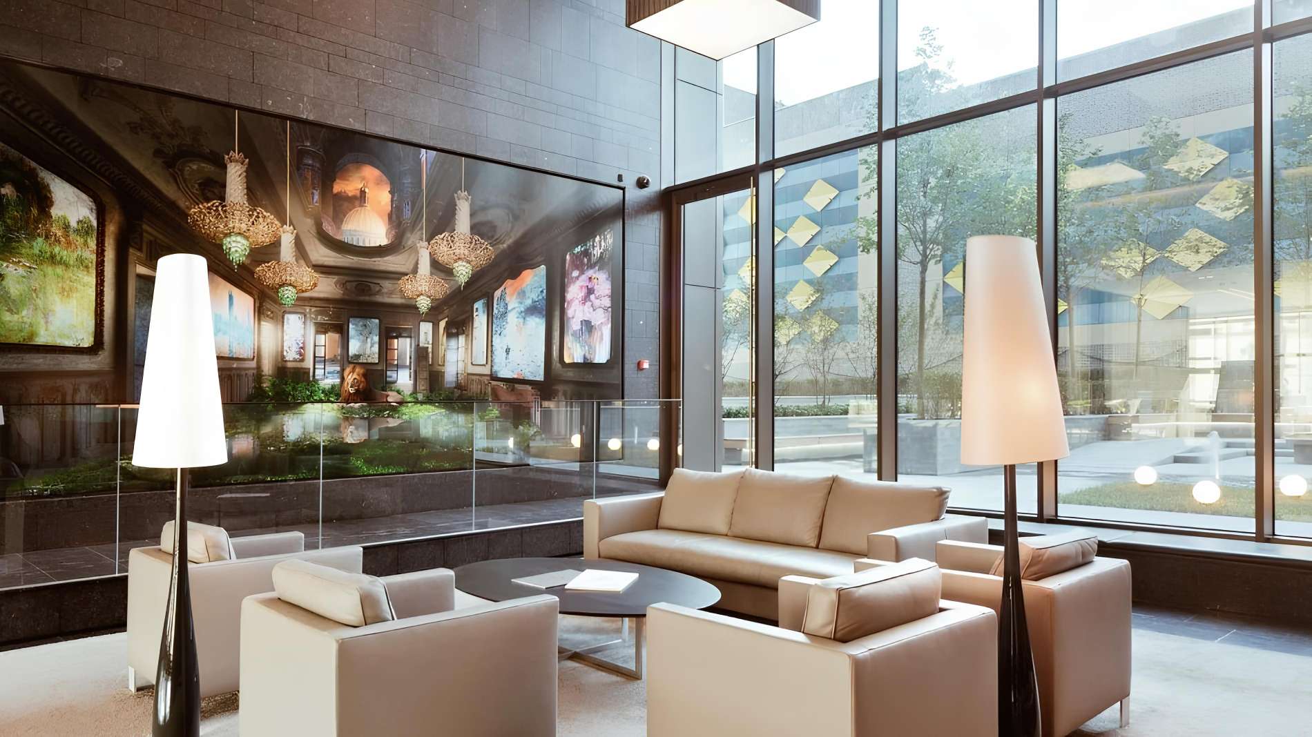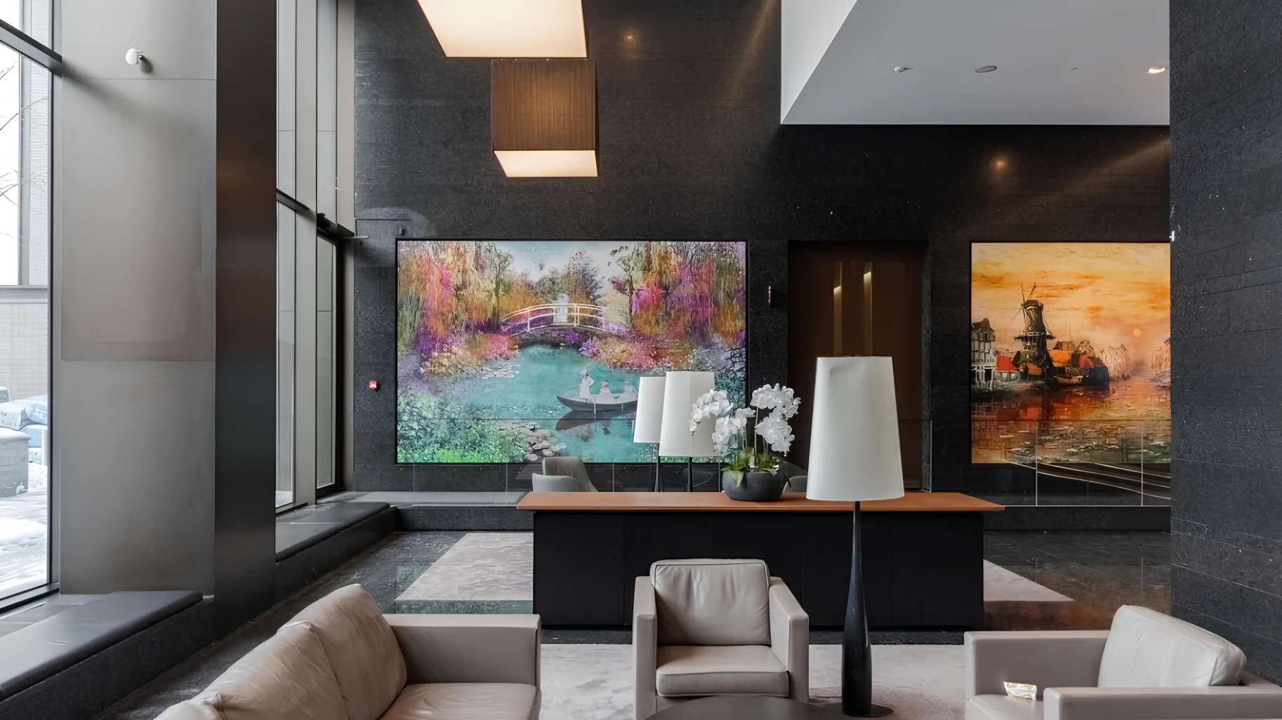 В лобби расположена картинная галерея с репродукциями работ Клода Моне, в честь которого назван комплекс.