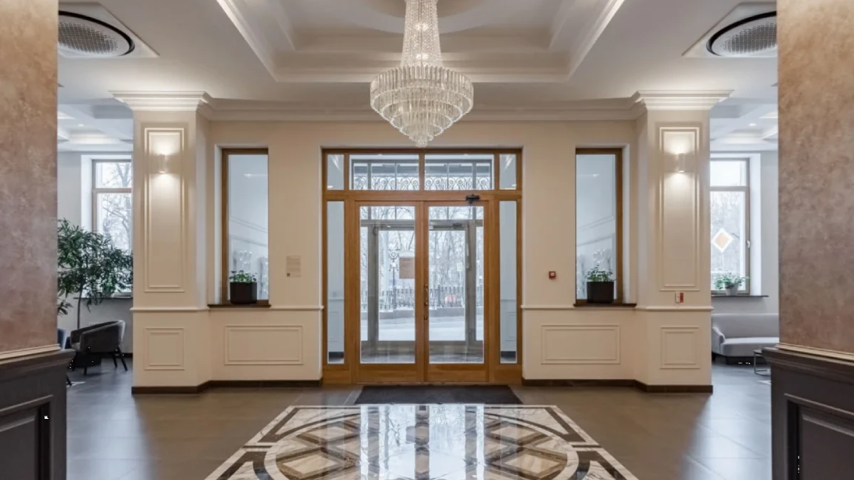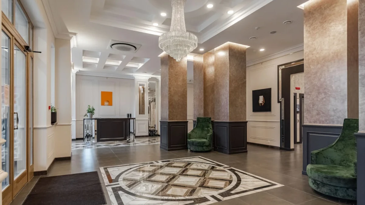 В зонах ожидания – мягкая мебель и камин, работает стойка консьержа. Отдельные входы на первом этаже ведут в офисные помещения для резидентов, что удобно для деловых встреч и повседневных задач.