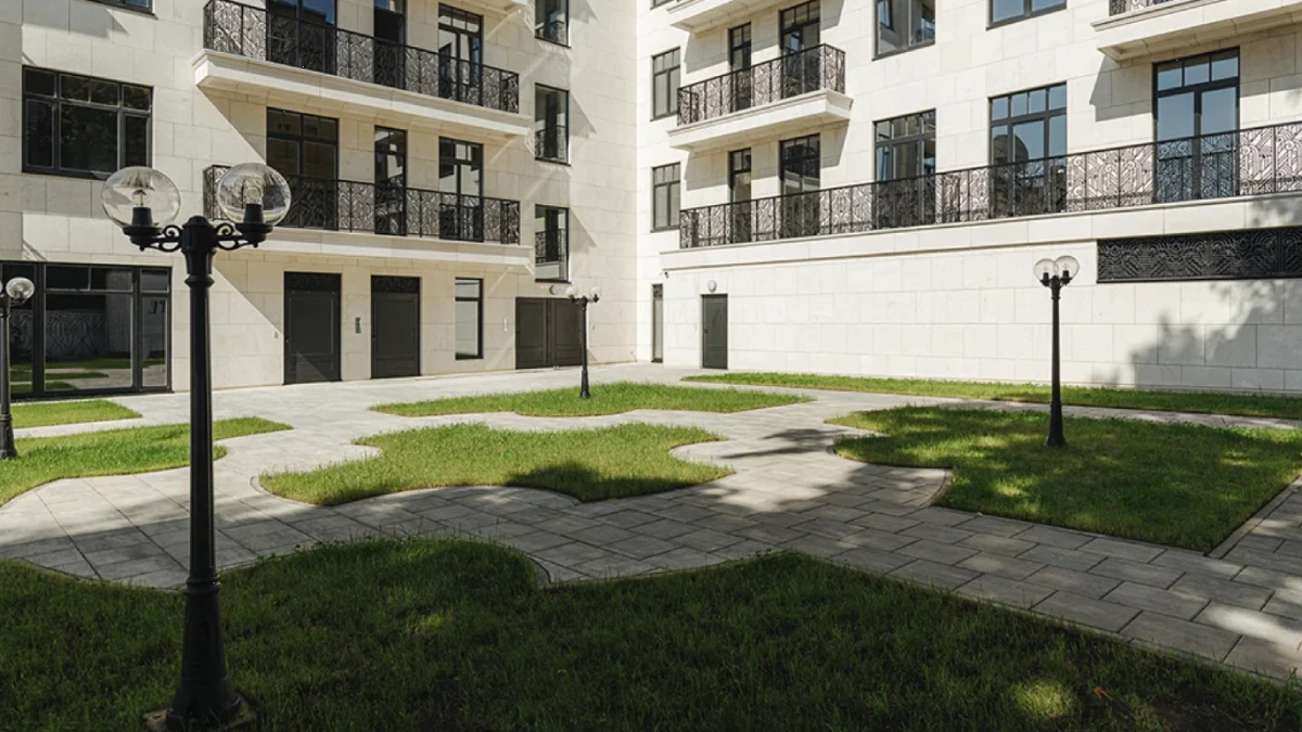 Во дворе жилого комплекса создан приватный ландшафтный сад с ухоженным газоном, дорожками и удобными лавочками – это спокойное пространство для отдыха с друзьями или уединения. Закрытый формат и продуманная планировка двора обеспечивают ощущение камерности и безопасности.