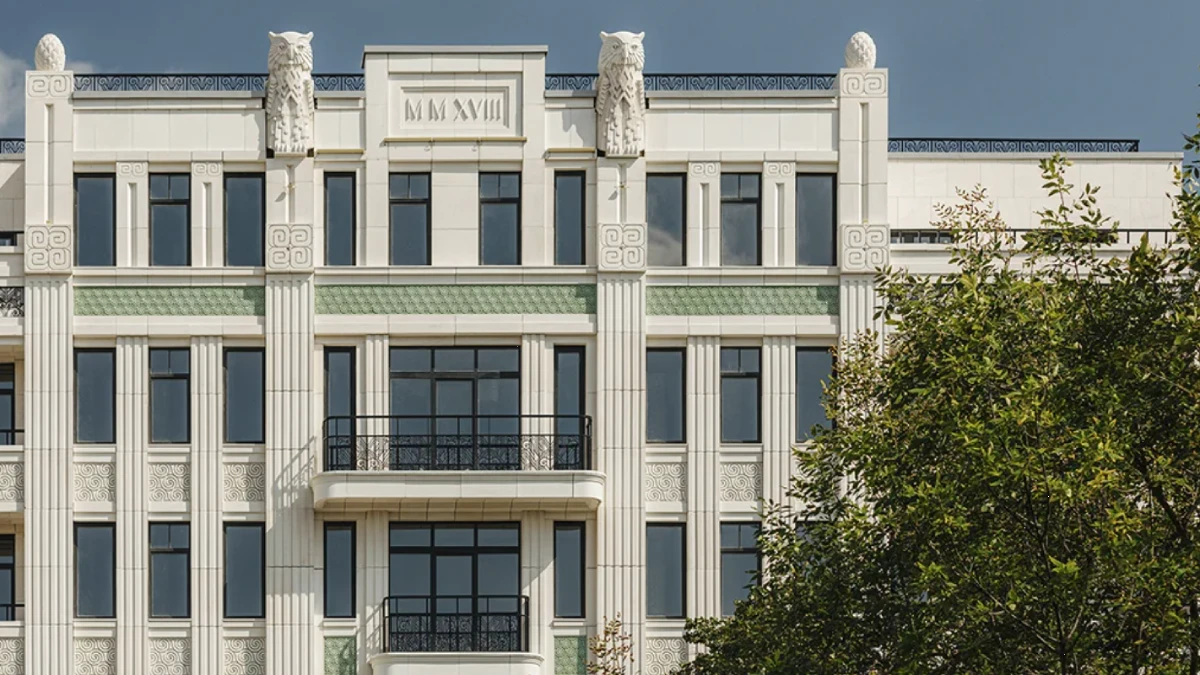 Здание спроектировано по мотивам австрийского и германского модерна. Автор концепции –архбюро «Мезонпроект». Фасады дома выполнены из натурального камня, их украшают изящные балконы с коваными ограждениями и скульптуры сов – выразительный штрих, создающий запоминаемый образ дома.