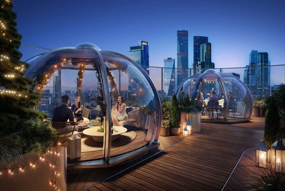 Здесь раскрываются одни из лучших панорам Москвы: Парк Победы, башни Сити, здание МГУ и гостиница «Украина» становятся частью интерьера.