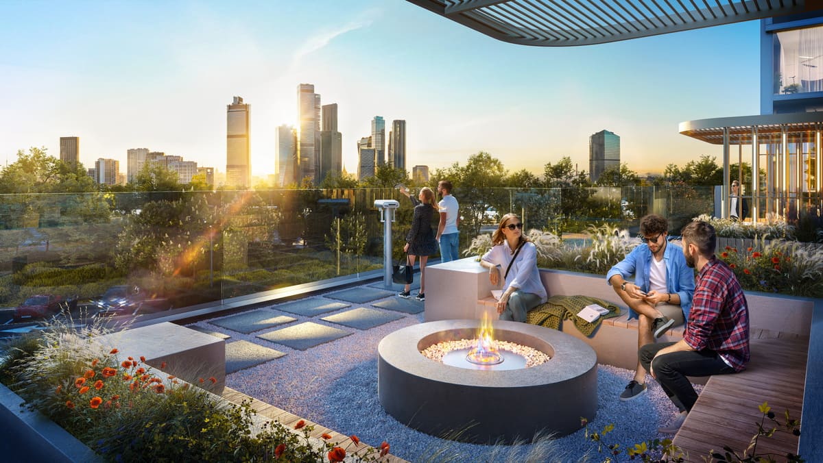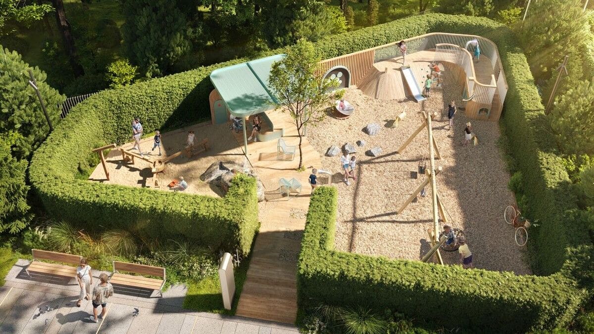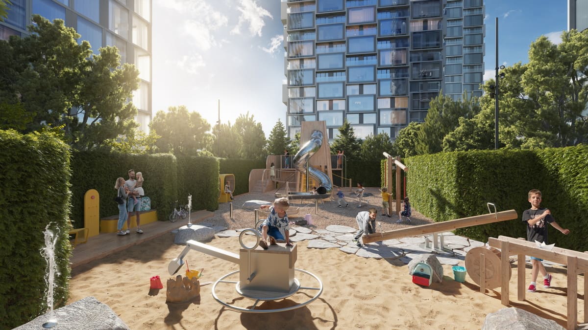 Двор предлагает открытые гостиные с очагами, воркаут-площадки с навесом, спортивные зоны, игровые пространства для детей всех возрастов, уютные цветущие сады и уединённые места с видом на реку.
