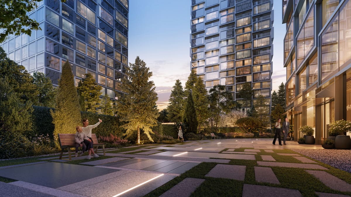 Комплекс утопает в зелени – за счёт просторного закрытого двора, который больше напоминает настоящий городской парк с взрослыми деревьями, цветущим садом и лаунж-зонами на открытом воздухе.