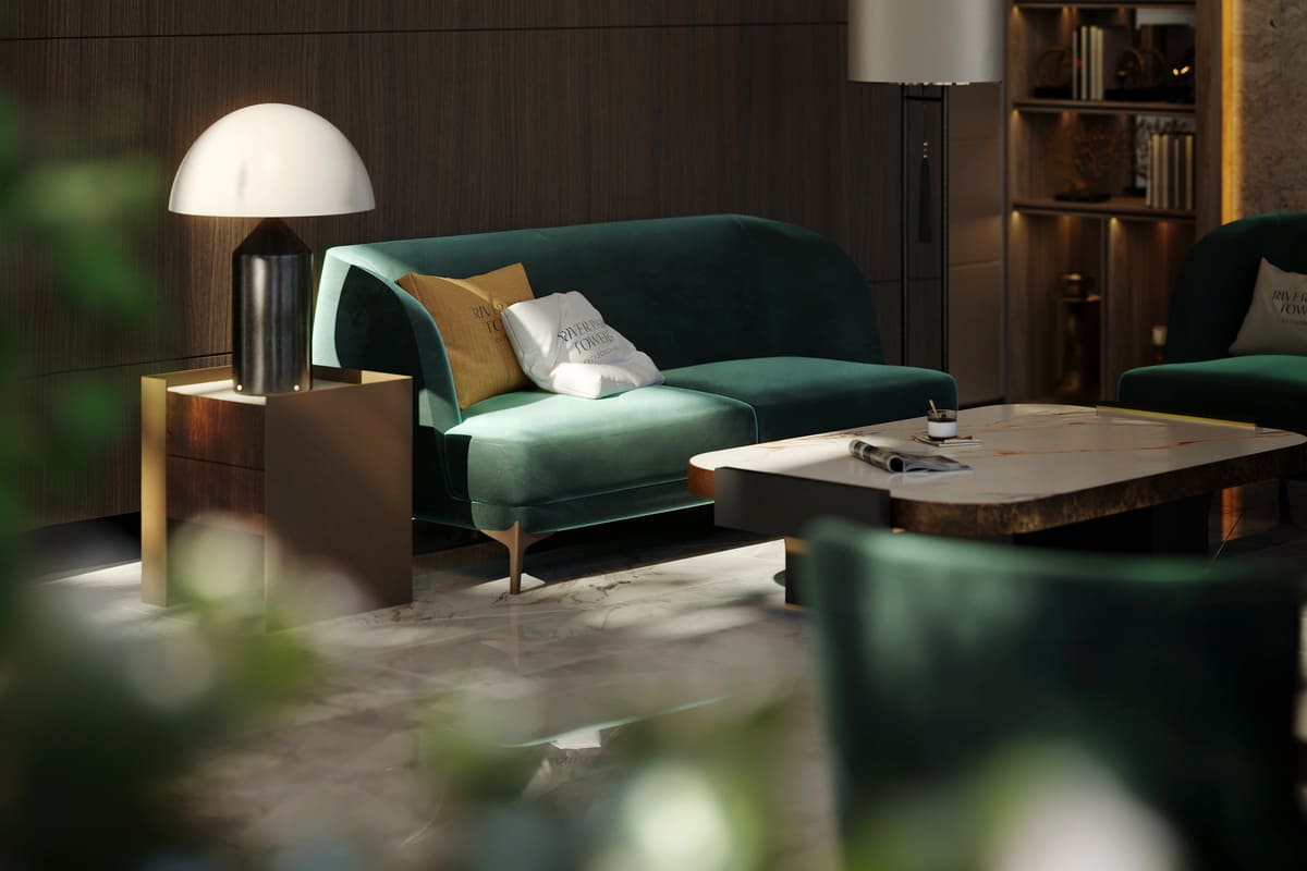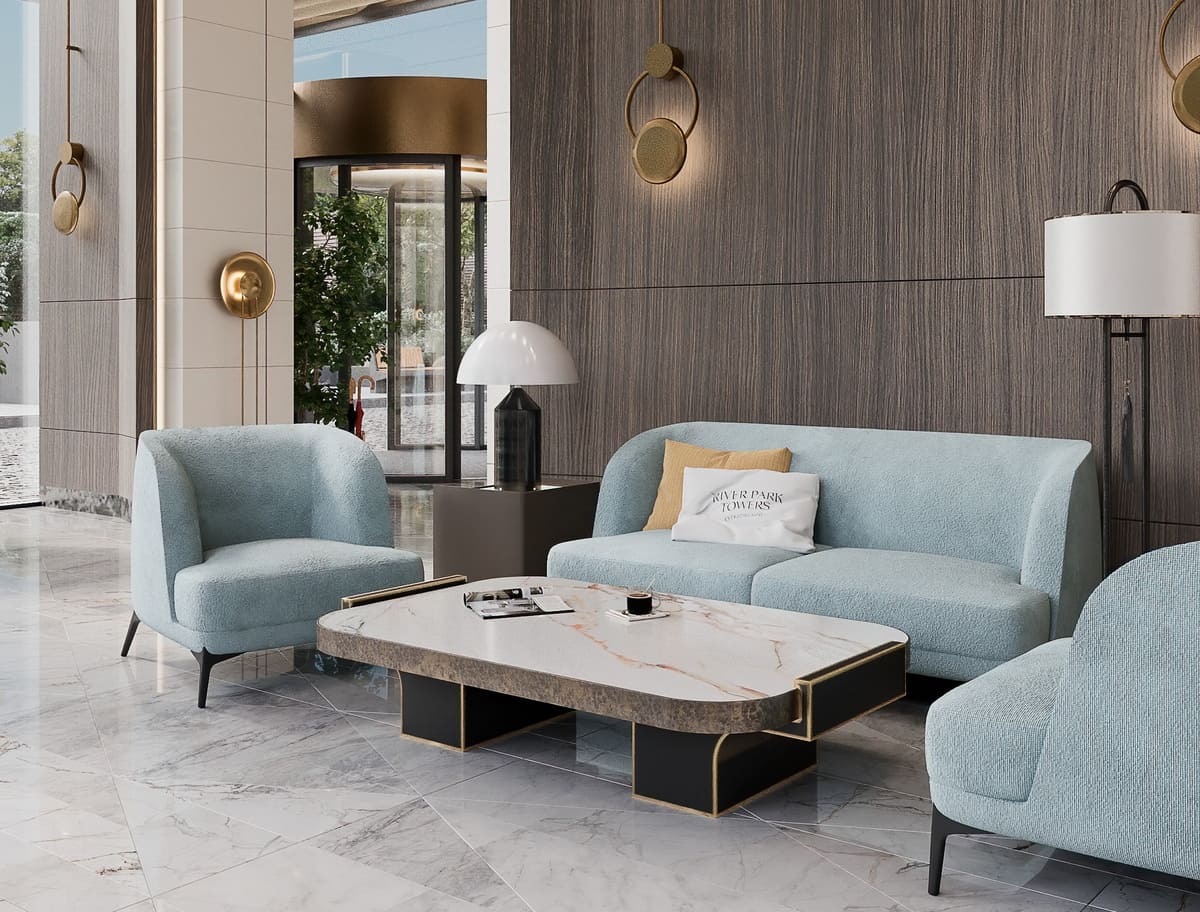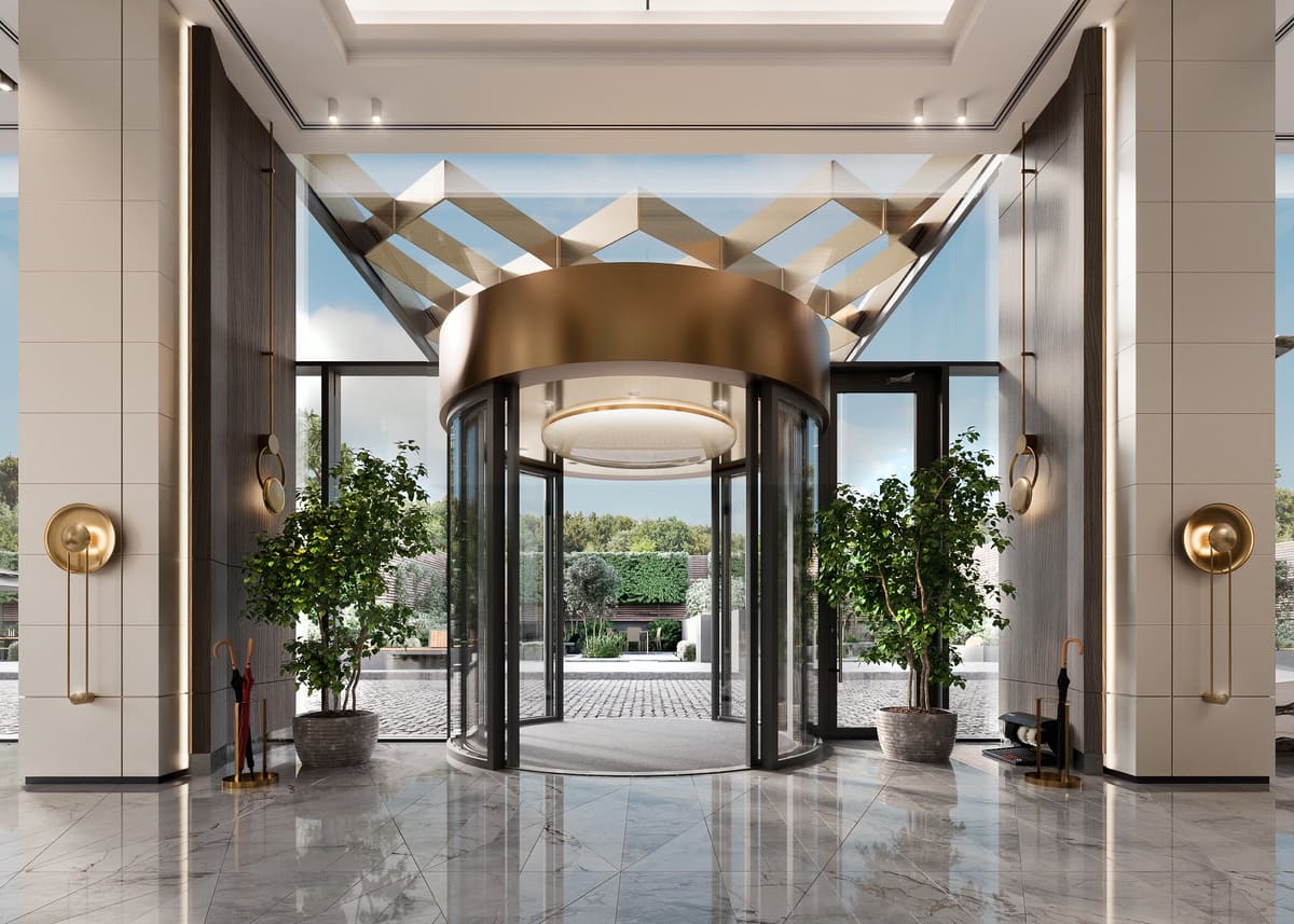 Полукруглые автоматические двери ведут в просторные лобби с потолками высотой 5 метров и площадью до 250 м². Дизайн выполнен в бежево-натуральной гамме с акцентами на фактурах: камень, дерево, металл, текстиль.