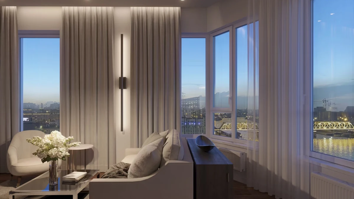 В проекте предусмотрен широкий выбор квартир – от студий до просторных многокомнатных квартир. Площадь варьируется от 27 м² до 143,8 м², что позволяет подобрать жильё под разные потребности. Окна в квартирах – панорамные, почти во всю стену, с высотой до 2,4 м, что наполняет пространство светом и создаёт ощущение простора.