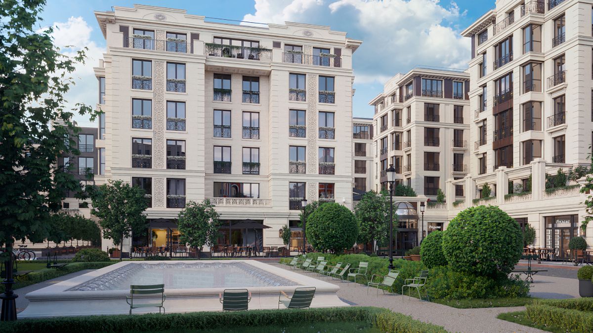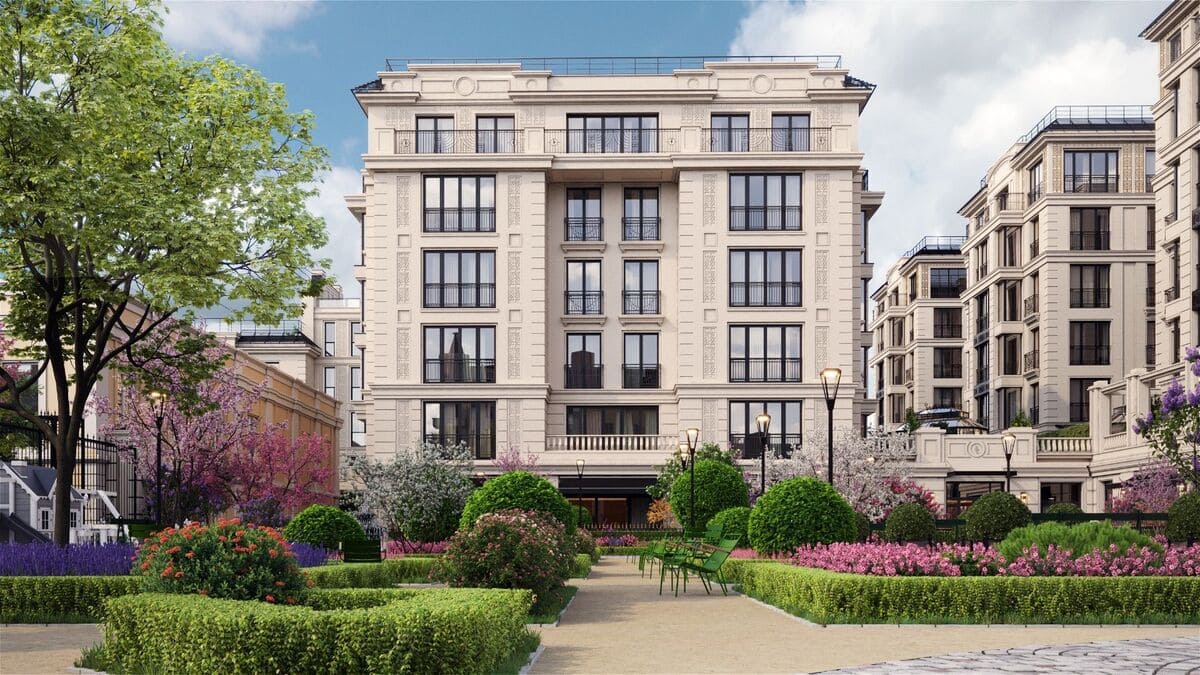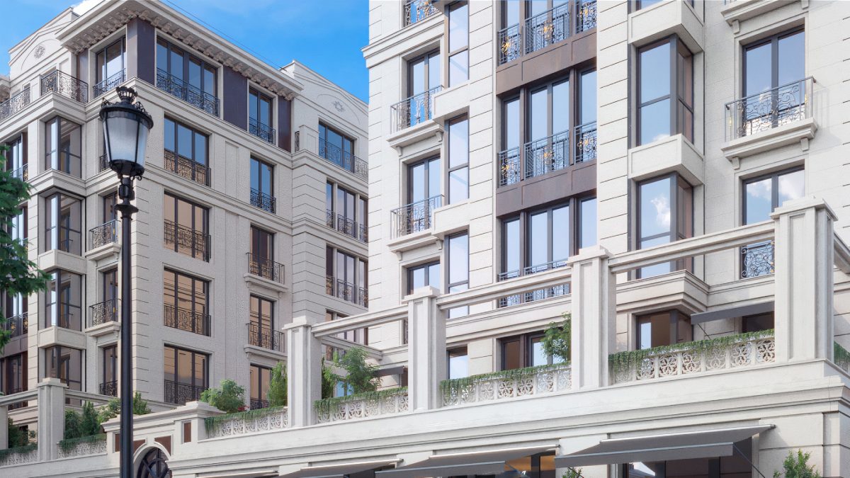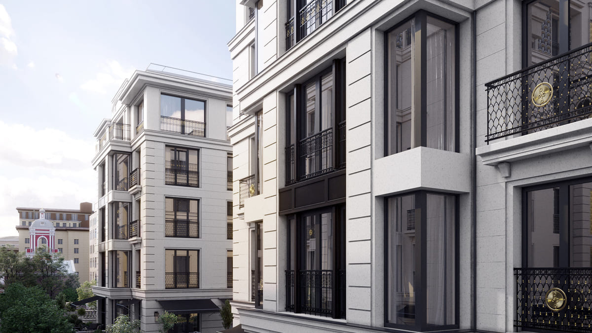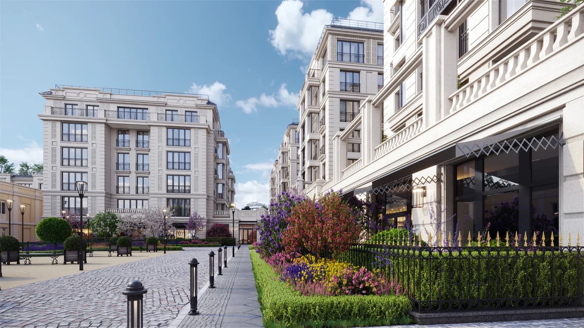 Каждый из 11 особняков выполнен в авторской архитектуре с классическими пропорциями и элегантными фасадами из светлого натурального камня, что подчеркивает респектабельность и статус проекта.