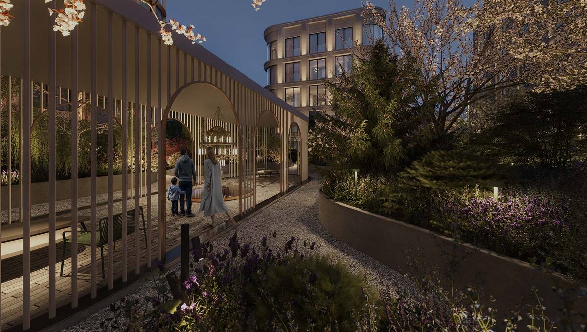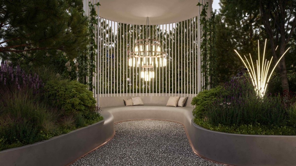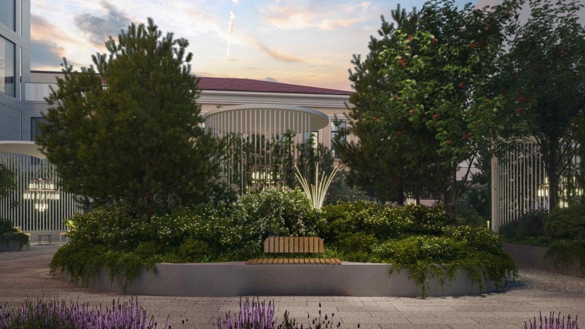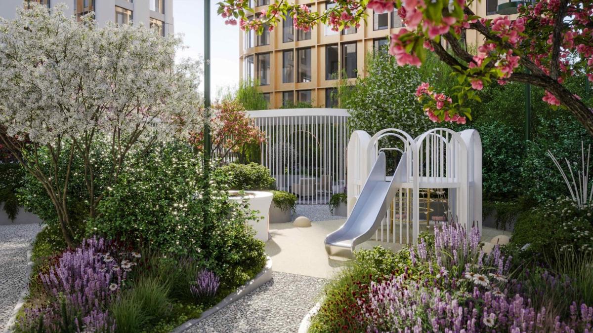 На территории расположены lounge-зоны, детская площадка, цветники и пешеходные маршруты. Атмосфера сада – тёплая и расслабляющая, словно продолжение домашнего пространства.