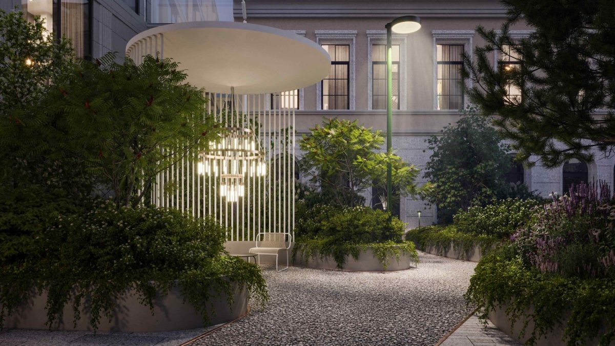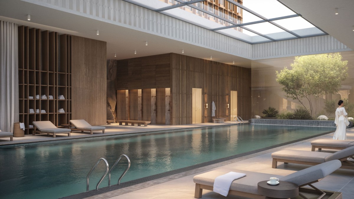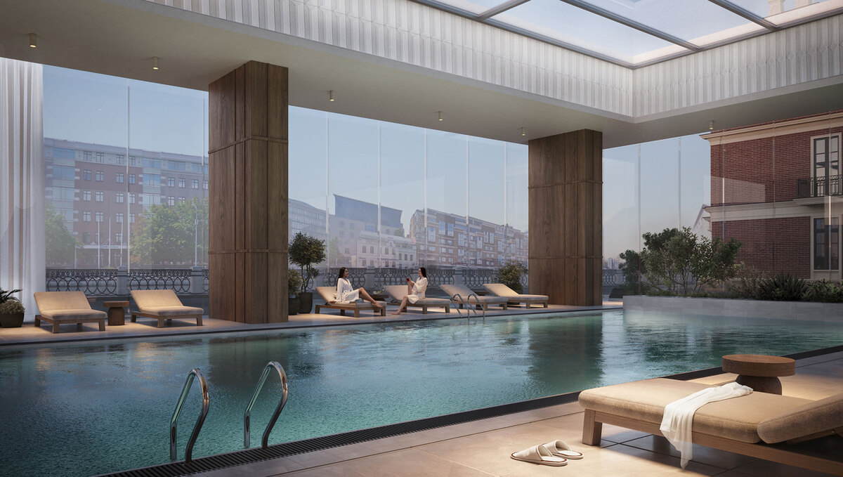 Внутреннее пространство комплекса – это тщательно зонированная территория с дизайнерским садом, вечерним мягким светом, lounge-зонами, spa-пространствами и уютным фитнес-залом с сауной и хаммамом.