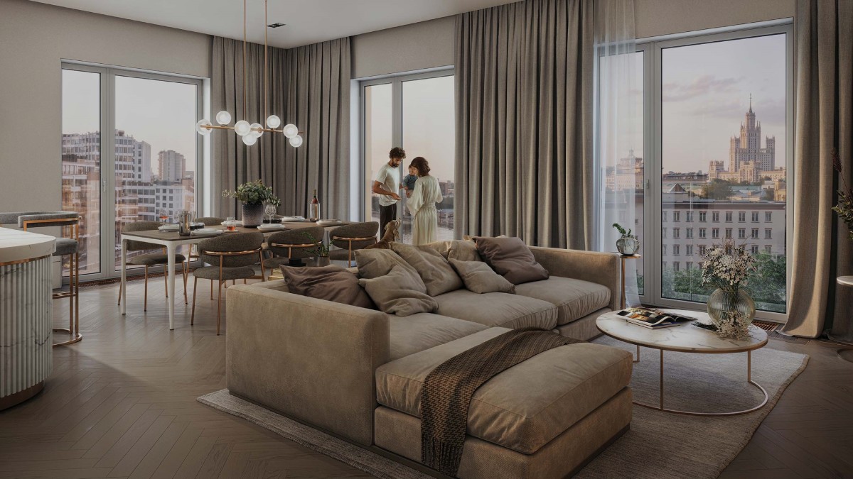 Каждое пространство спланировано с акцентом на свет и воздух – высота потолков, панорамные окна и функциональные зонирования позволяют жилью дышать.