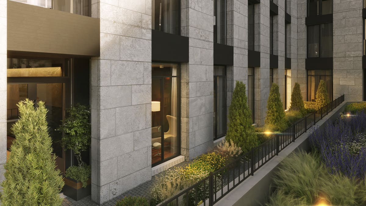 Фасады со стороны улицы выдержаны в классических пропорциях – в духе старинных особняков. Здесь расположена коллекция урбан-вилл с приватными входами. Со стороны набережной здания раскрываются светлыми фасадами с отделкой из белого натурального камня – их окна обращены прямо к реке.
