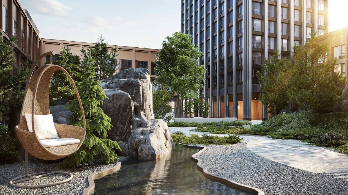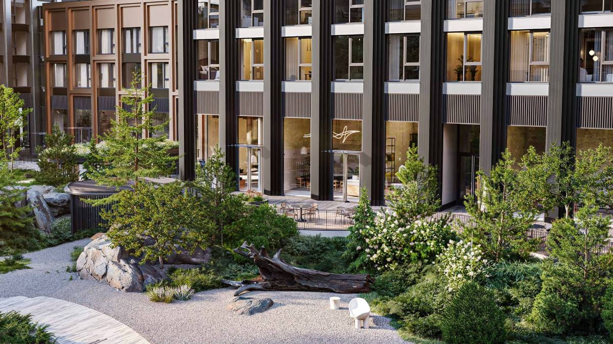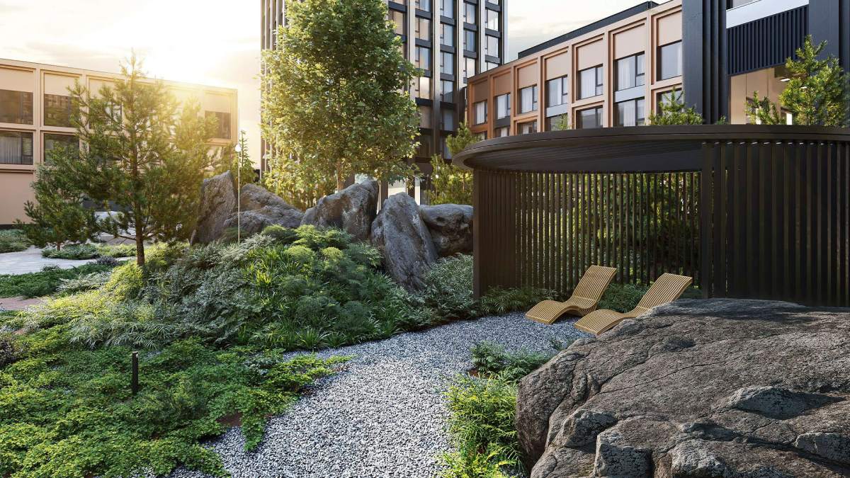 Двор SET.1 выполнен в скандинавском стиле: здесь природные камни, скальные элементы, пруд, площадки для йоги, детские зоны и воркаут-пространства. Для отдыха обустроены шезлонги и lounge-зоны с террасой.