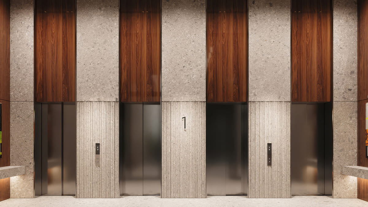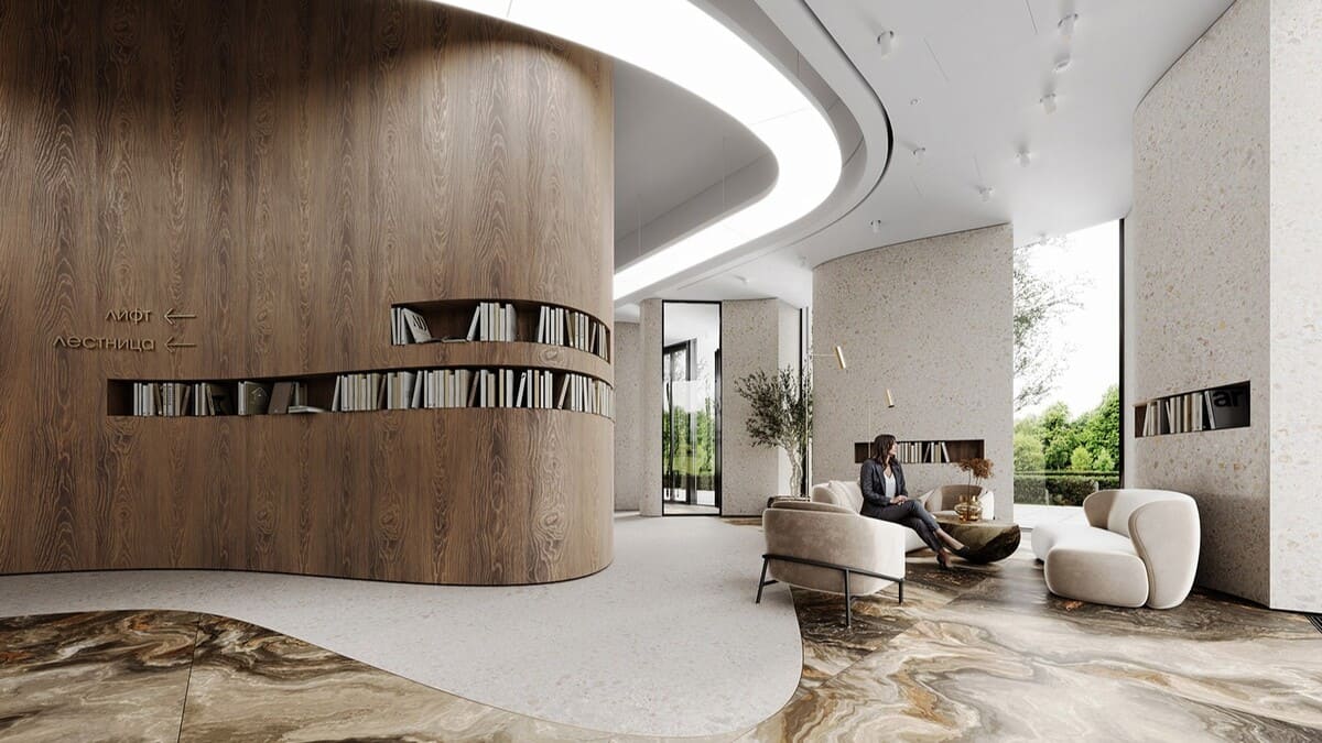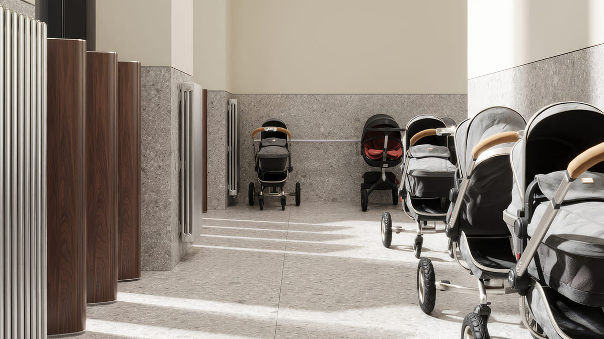 Все лобби дополнены зонами ресепшена, постаматами, колясочными и лапомойками, что делает пространство не только эстетичным, но и максимально функциональным.