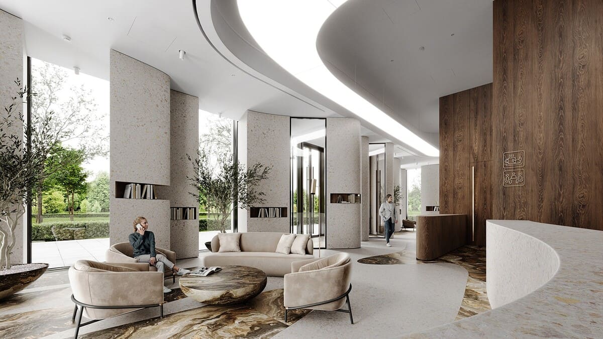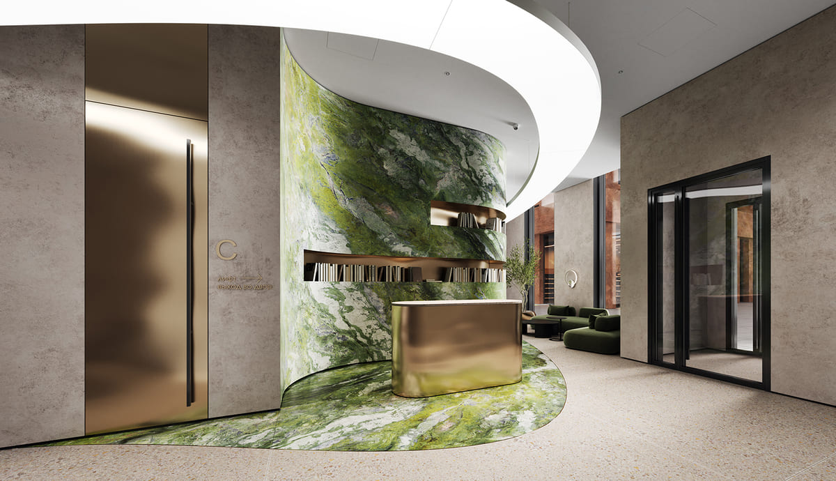 Интерьеры входных групп в башнях SET.1, разработанные бюро RYMAR.STUDIO, создают атмосферу пятизвёздочного отеля. Высокие потолки, использование натурального камня, металла и фактурного терраццо, а также дизайнерская мебель формируют стильное и статусное пространство.