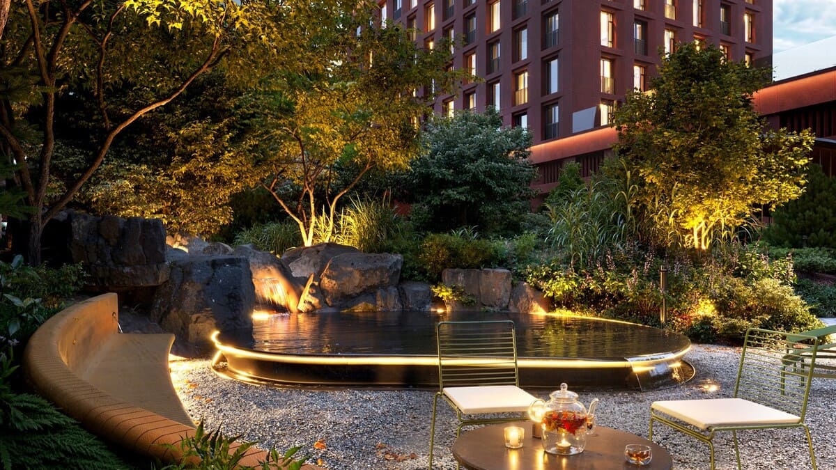 Территория SET.2 напоминает лесной ландшафт: в центре расположен пруд с мини-водопадом и lounge-зоной, а также детская площадка и эксплуатируемая кровля с панорамной террасой.