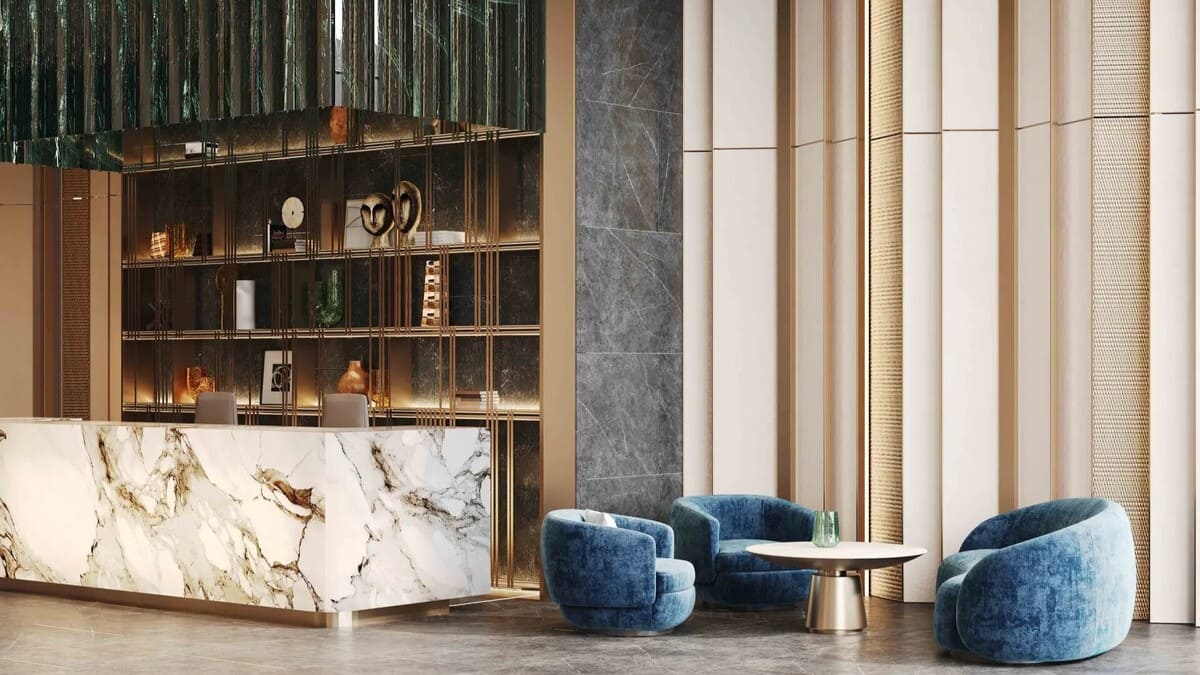 Лобби украшают арт-объекты и световые инсталляции с интеллектуальной настройкой сценариев освещения.