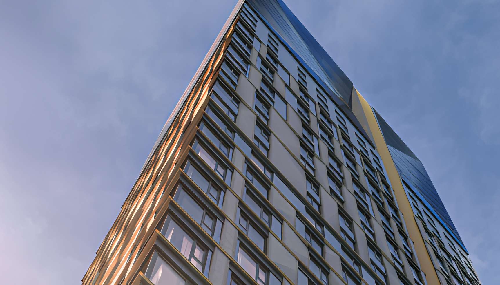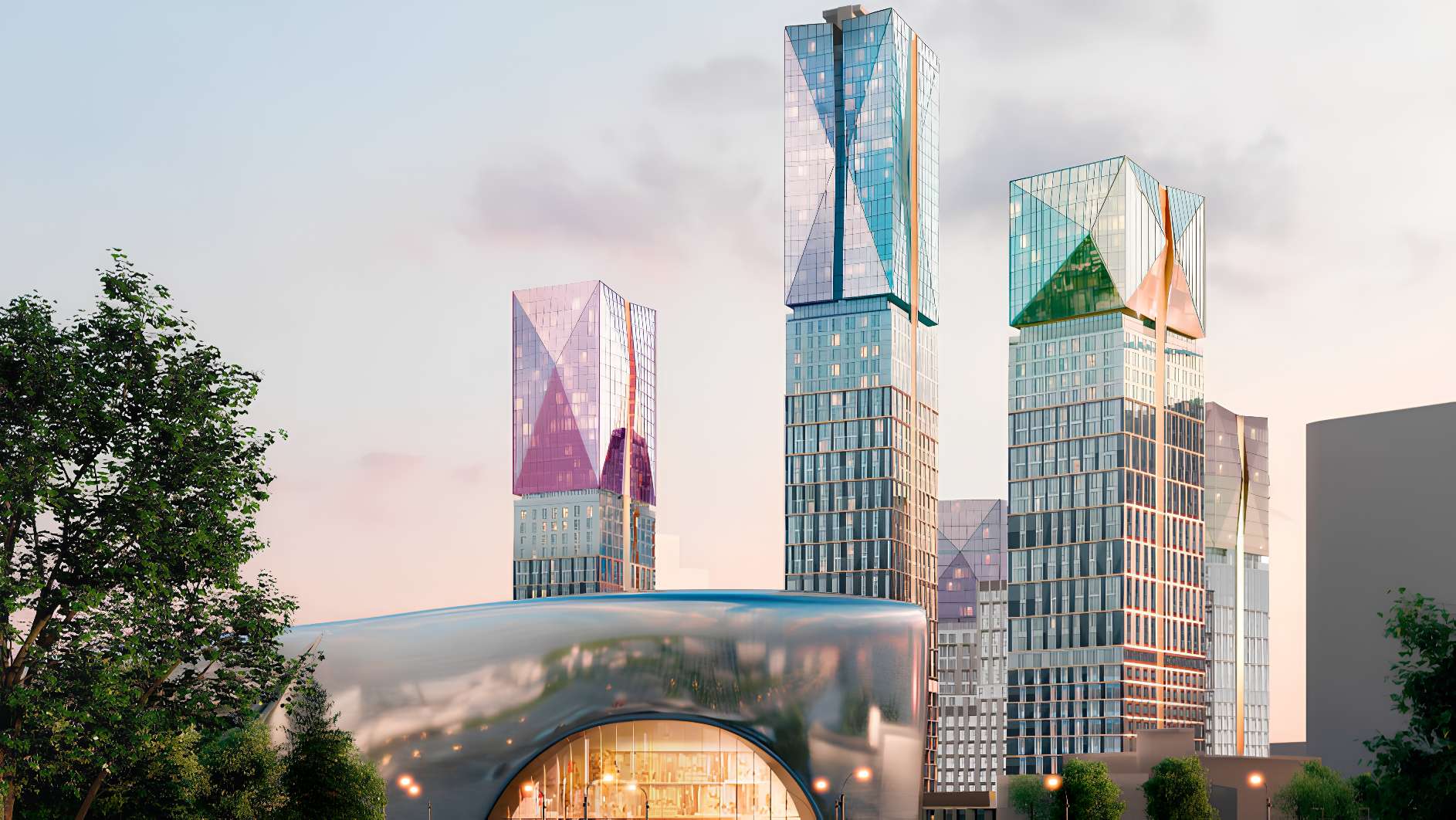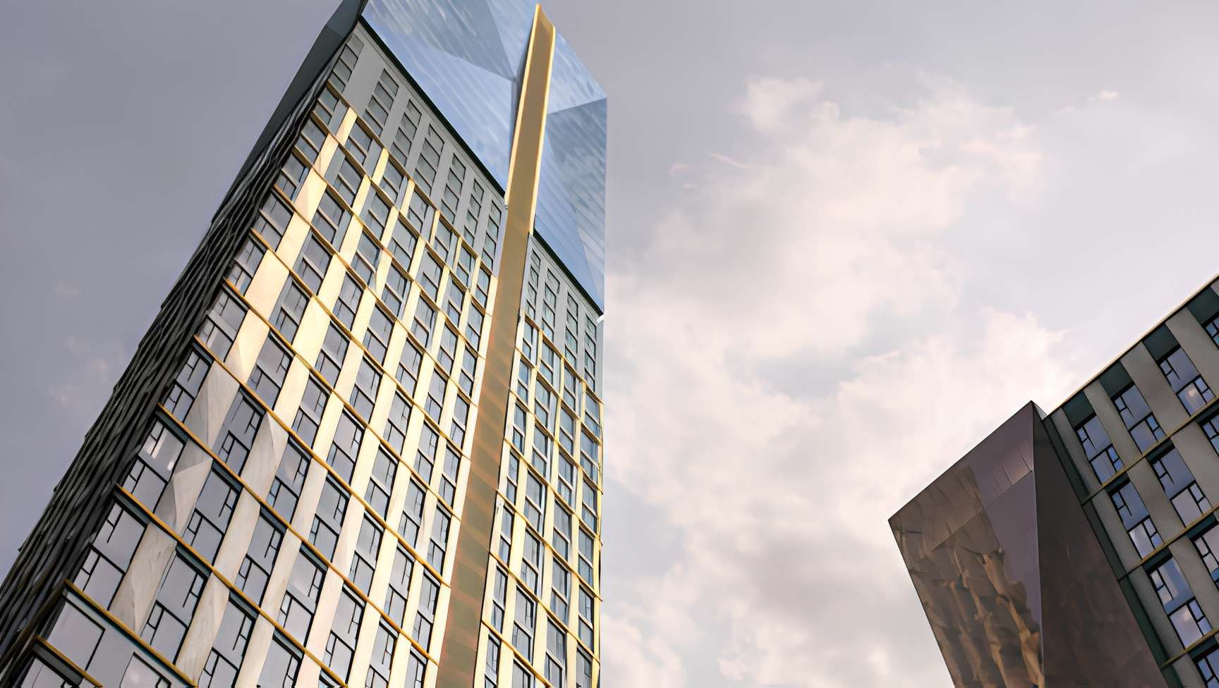 Динамичный фасад с ритмичным чередованием панорамного остекления и каменных панелей создаёт неповторимый кристаллический силуэт.