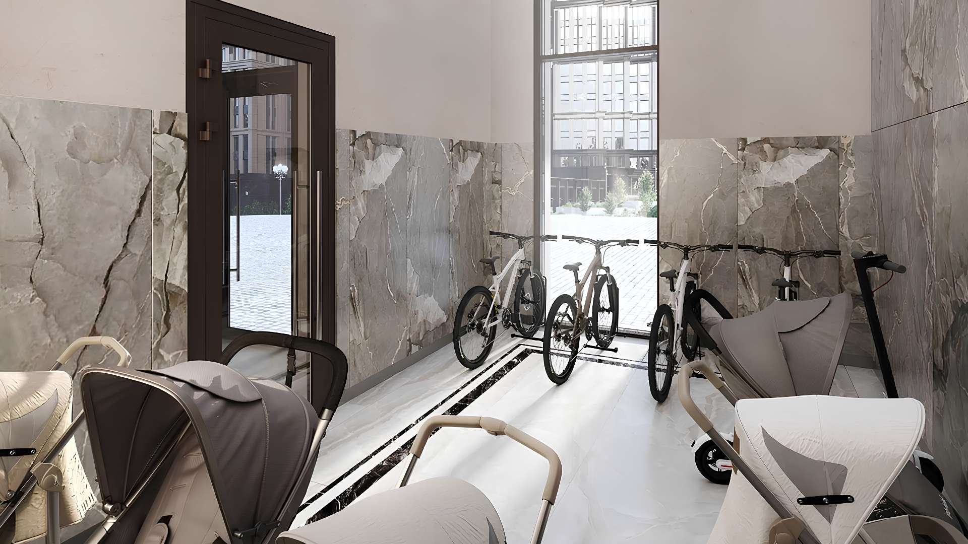 Пространства включают гостевые санузлы, лифтовые холлы, зоны для почтовых ящиков и помещения для ухода за питомцами. Высокие потолки и безупречная отделка создают атмосферу эстетического наслаждения с самого первого взгляда.