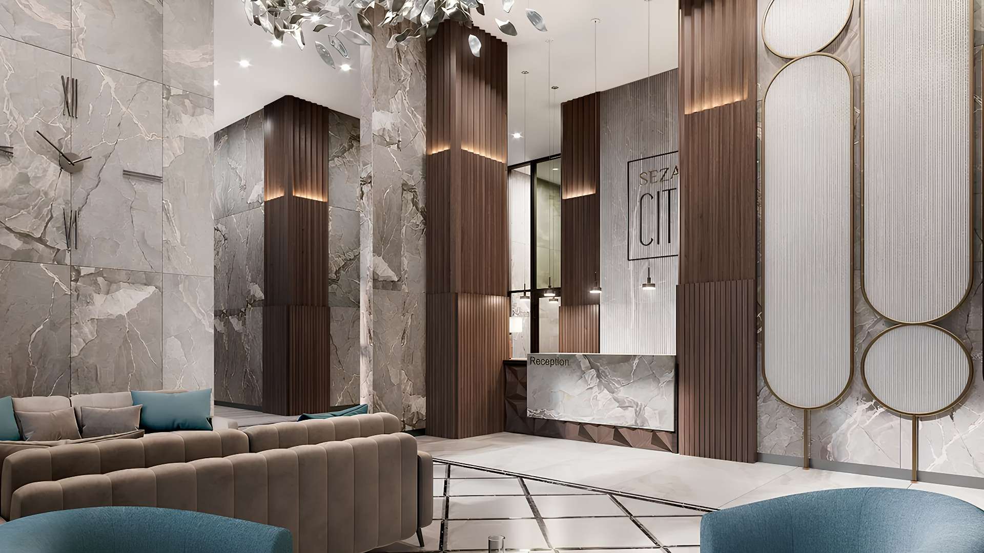 Роскошные лобби, спроектированные студией Nobbey, представляют собой полноценные арт-пространства. Интерьеры выполнены в двух стилях с использованием премиальных материалов: керамогранита под мрамор, алюминиевых листов и стеклофибробетона.