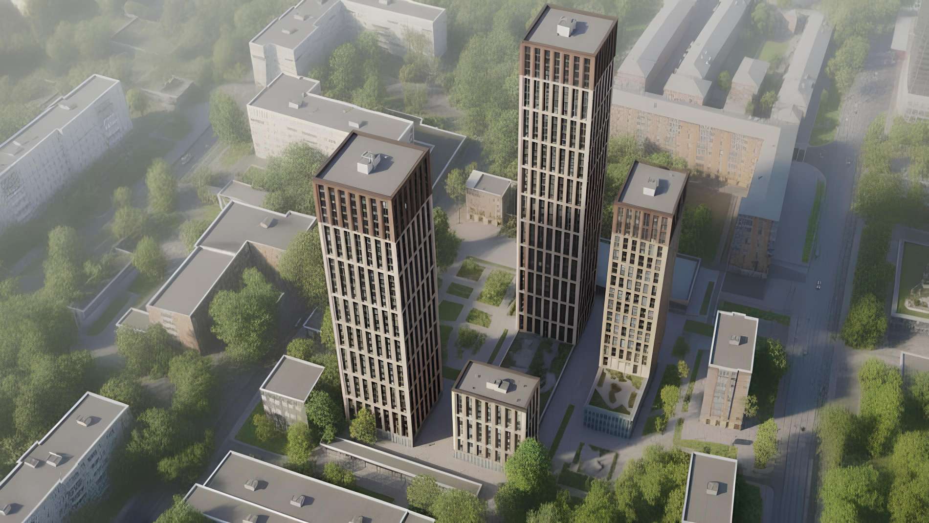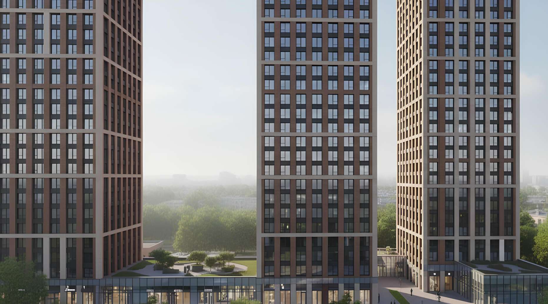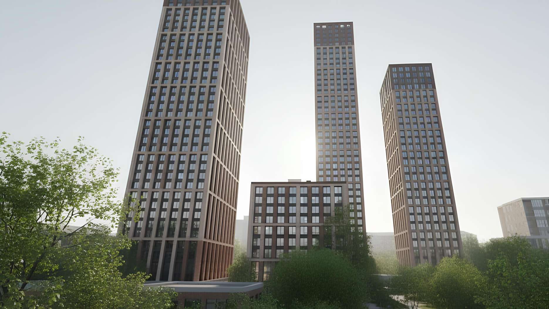 Фасады зданий облицованы тёплым керамогранитом и металлом, что создаёт сдержанный и благородный облик.