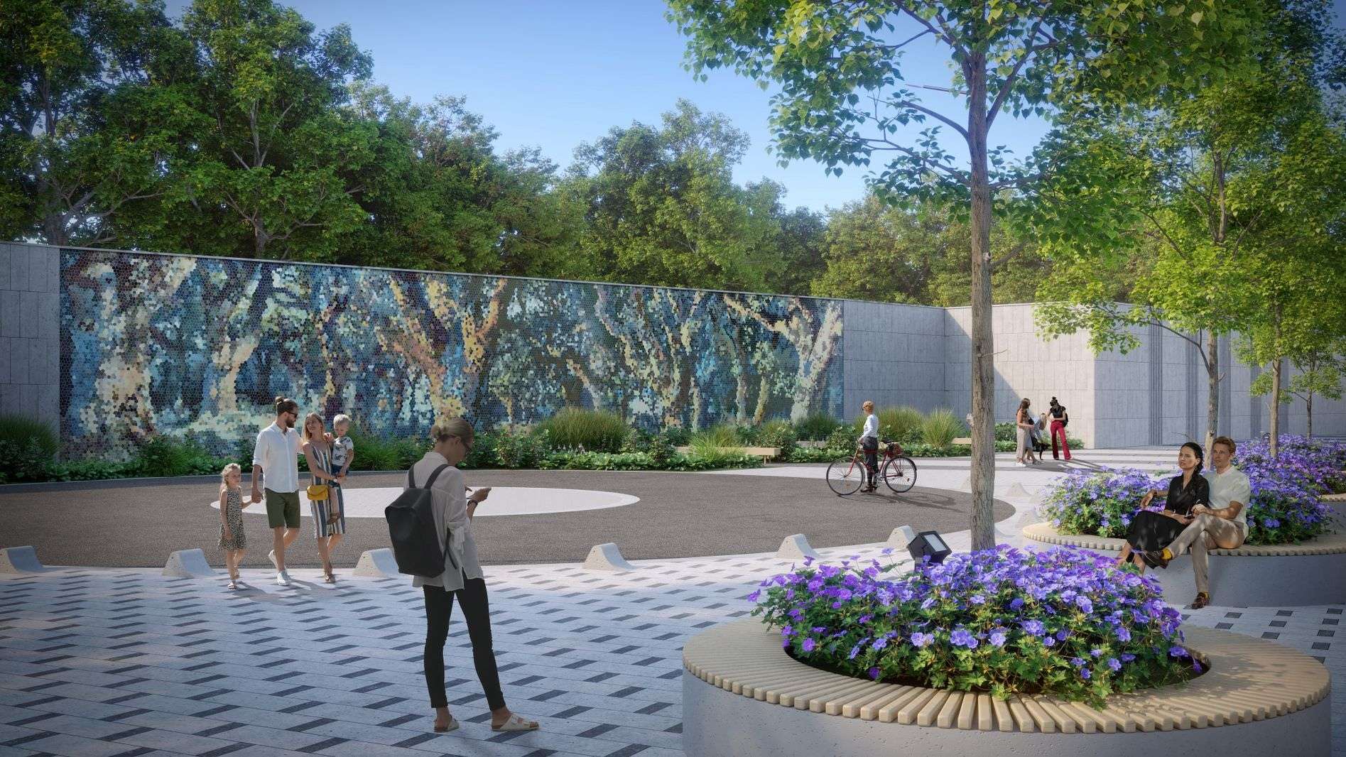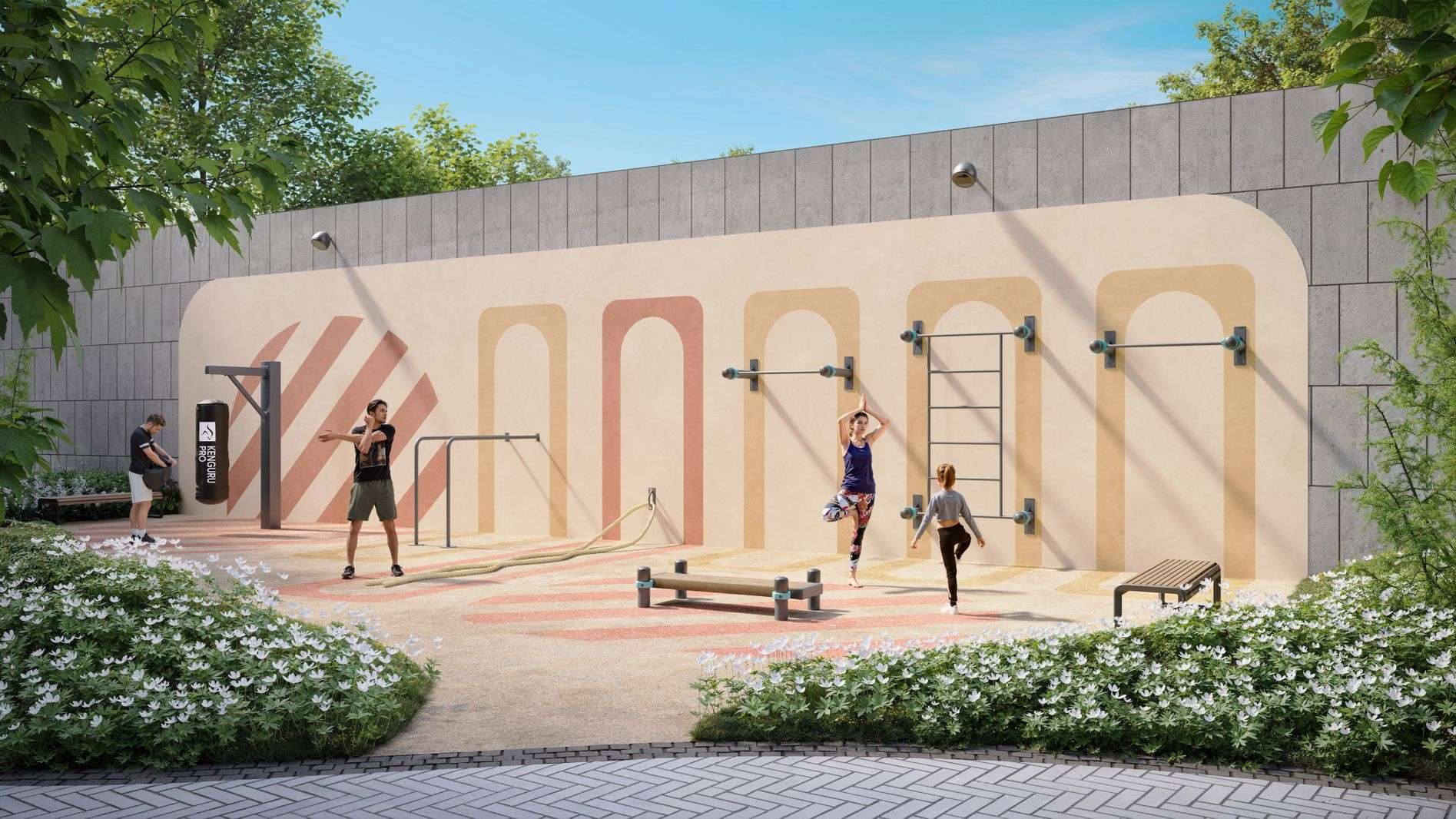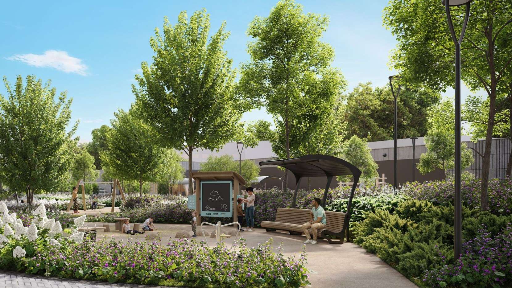 Ландшафтный дизайн включает в себя зеленые зоны с разнообразными растениями, дорожки для прогулок и уютные уголки со скамейками.