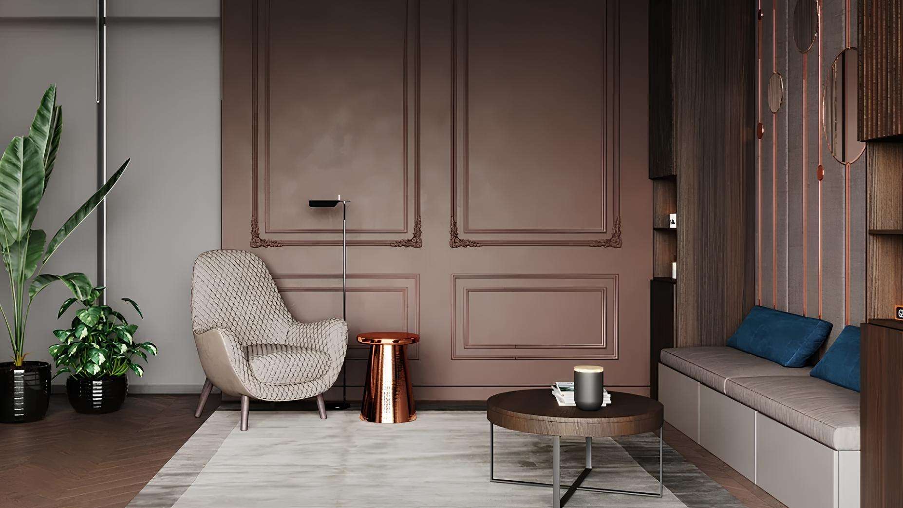 Центральным элементом является гостиничная стойка ресепшен, где дежурит круглосуточный консьерж-сервис. Зона мини-гостиной оборудована комфортабельной мягкой мебелью и предметами декора, создавая уютную атмосферу для ожидания или неформальной встречи. Это элегантное пространство служит визитной карточкой комплекса, воплощая его философию безупречного сервиса и внимания к деталям.