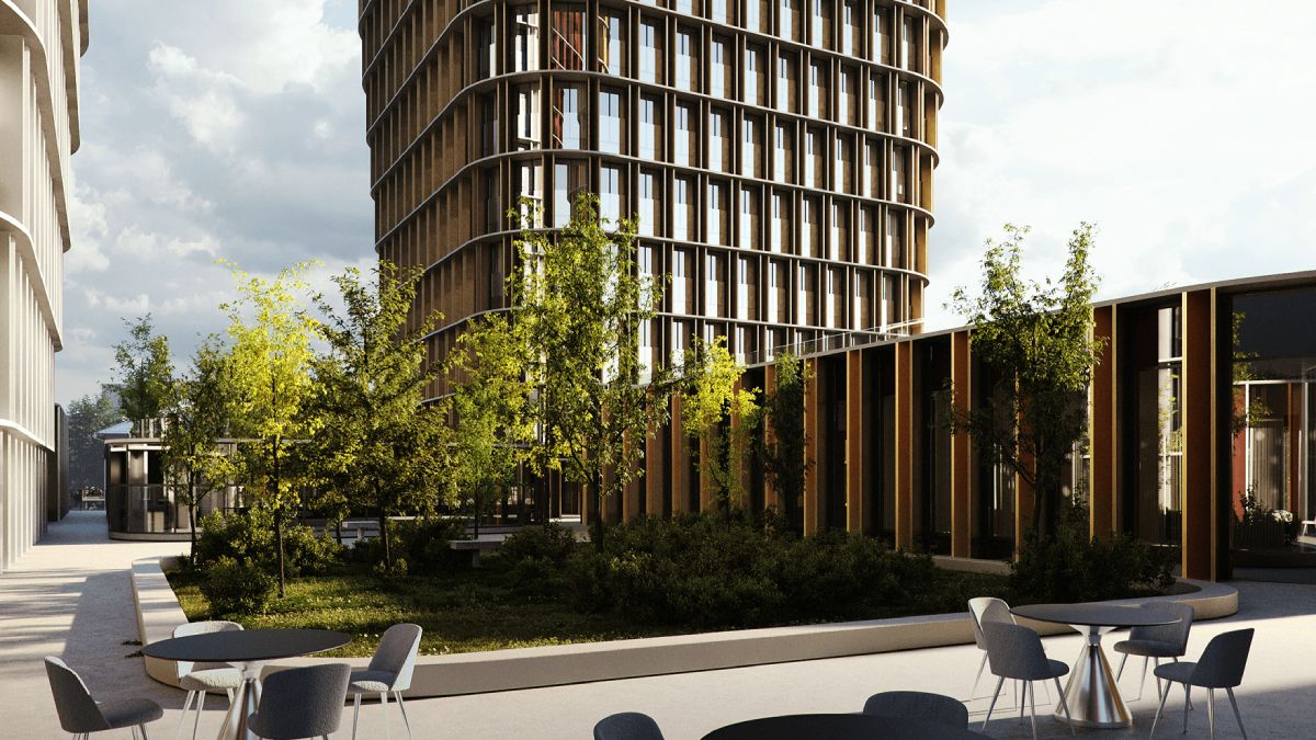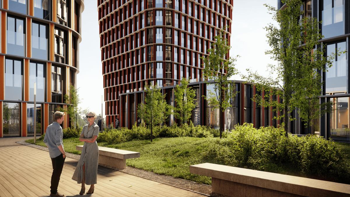 Внешняя часть комплекса органично переходит в просторный стилобат с функциональными общественными пространствами и внутренним двором, расположенным на уровне третьего этажа. Здесь – террасы с озеленением, тихие прогулочные зоны и уютные площадки.