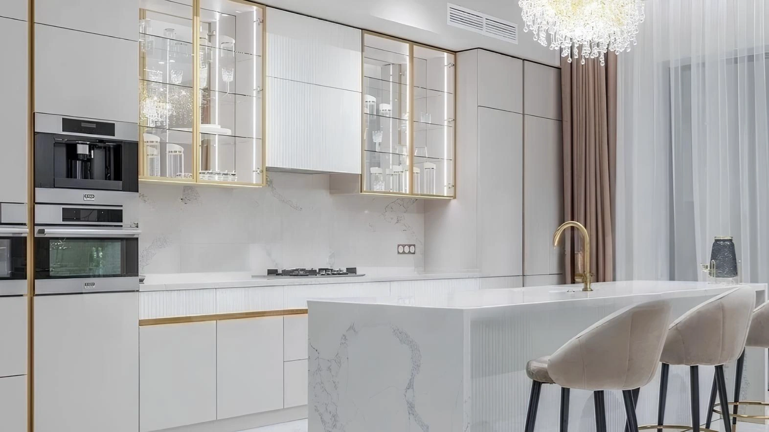 Фасады зданий облицованы премиальными натуральными материалами: иранским травертином, португальским известняком и немецким клинкерным кирпичом ручной работы. Визуальную легкость и современный облик комплексу придают панорамные окна в алюминиевых рамах и консольные стеклянные ограждения балконов.