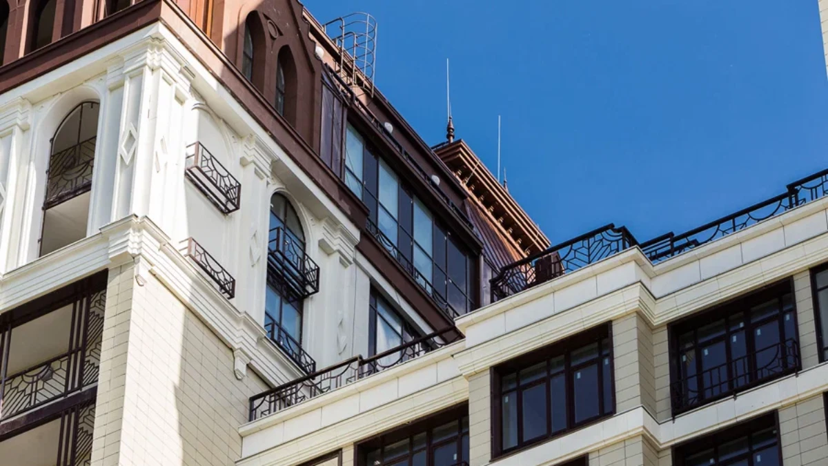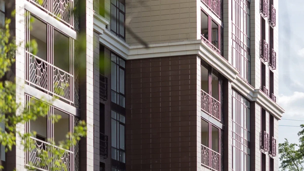 Здание выполнено с отсылками к неоготике: ступенчатые башни, стрельчатые проёмы, строгие вертикальные эркеры и балконы, декоративная стилизованная ковка. Фасады облицованы премиальным итальянским керамогранитом Graniti Fiandre – это придаёт дому выразительный и долговечный облик.