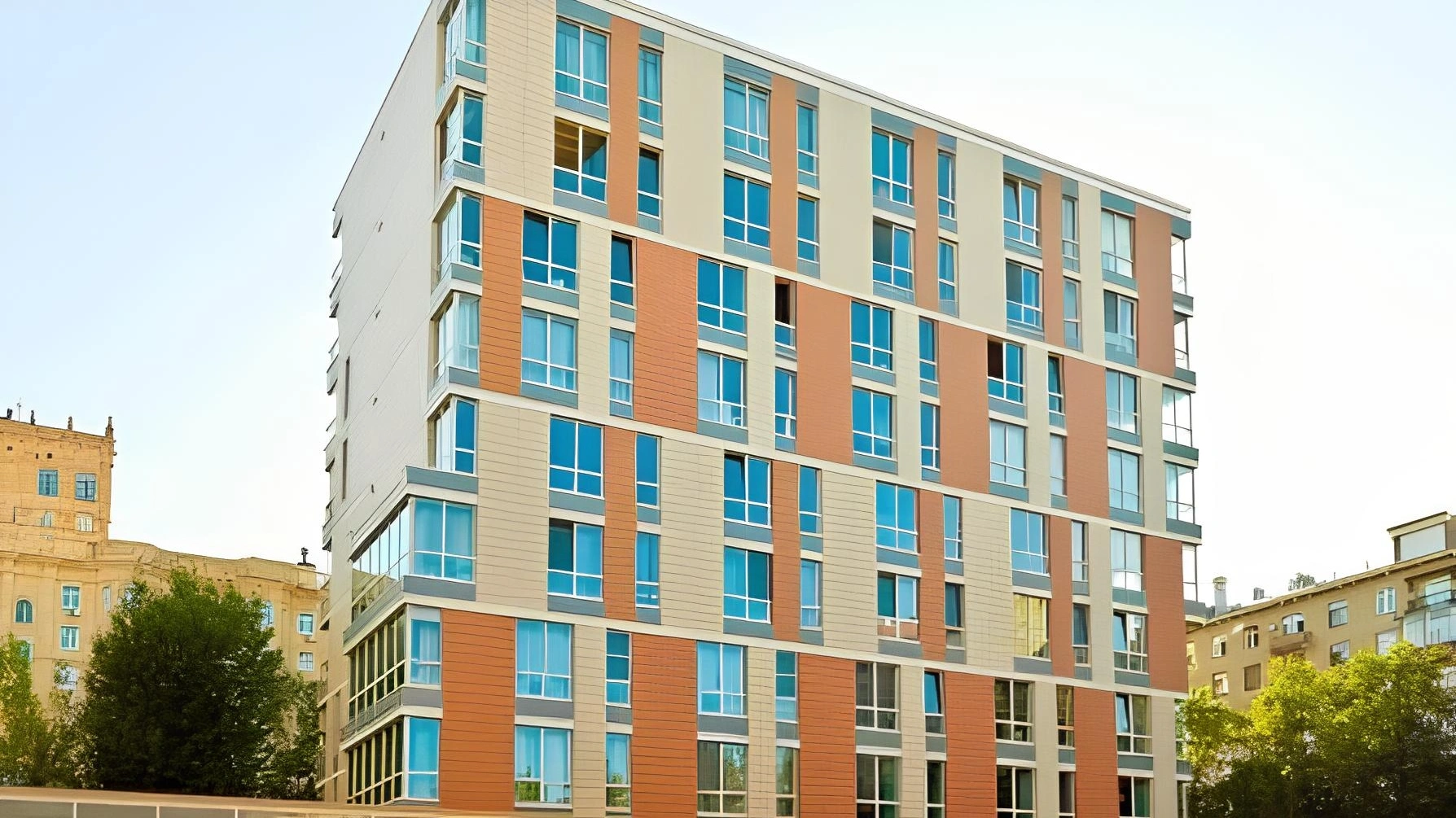 Фасады зданий облицованы качественной фасадной плиткой теплых оранжевых и бежевых оттенков, что добавляет комплексу элегантности и индивидуальности. Большие панорамные окна, включая эркерные, обеспечивают прекрасную инсоляцию и наполняют квартиры обилием естественного света.