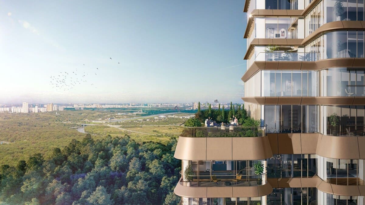 Зелёные террасы продолжают диалог с природным окружением, а плавные изгибы здания будто переносят в органичную архитектуру ближайшего будущего.