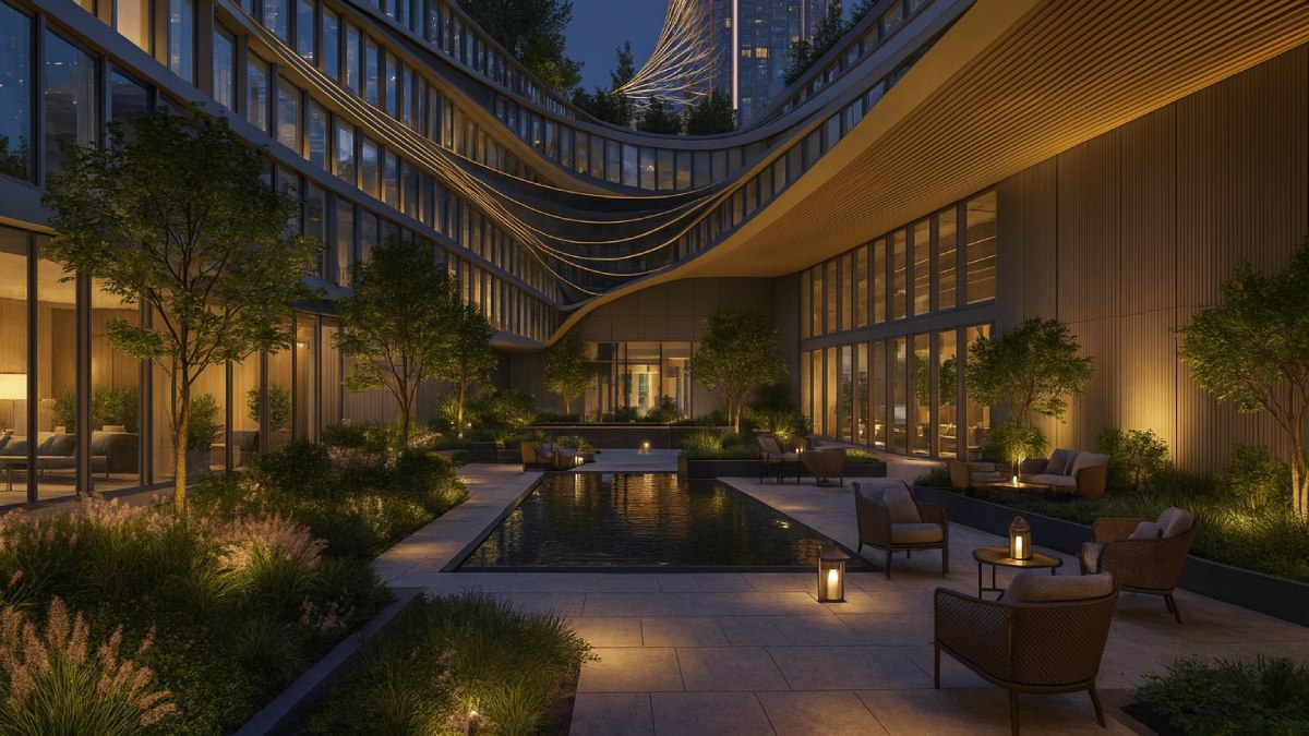 На 7-м этаже комплекса расположится приватный парк с уникальной атмосферой и полноценной инфраструктурой для жителей: уютные lounge-зоны, бассейны под открытым небом, пространства для отдыха и встреч.