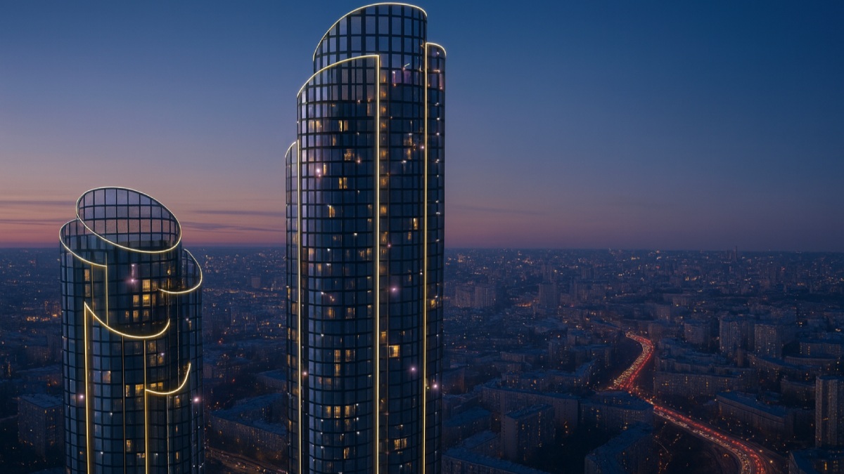 Динамичный силуэт зданий подчёркивается продуманной архитектурной подсветкой и панорамным остеклением, которое открывает захватывающие виды на центр Москвы и деловой квартал.