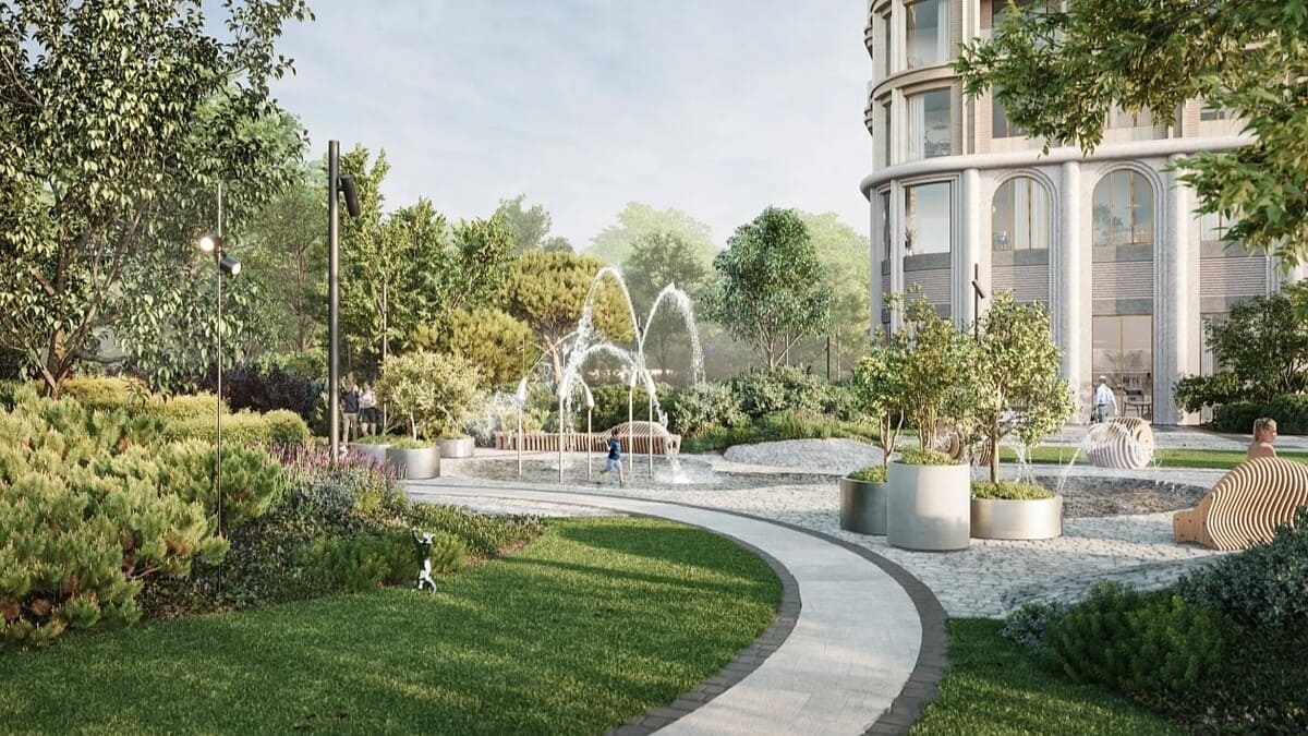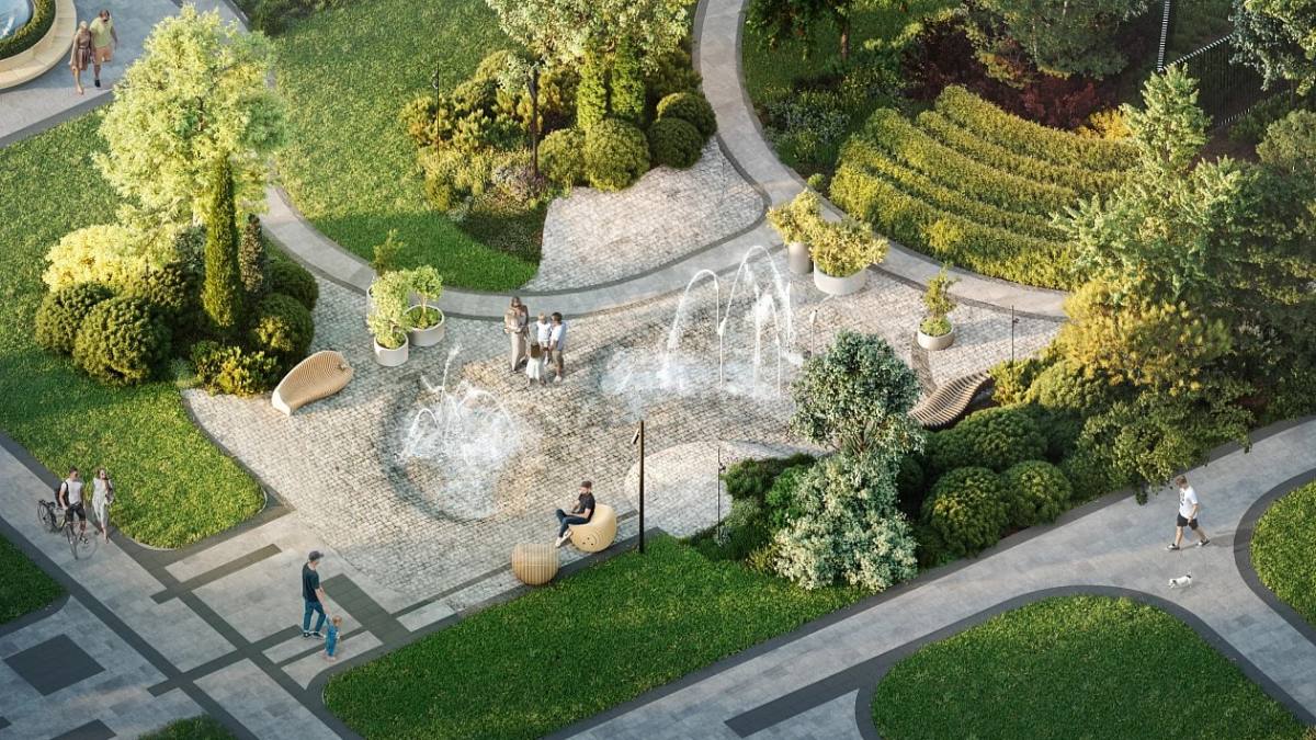 На территории – входная парадная площадь, фонтаны, арт-объекты, аллеи, а также уютные зелёные уголки для отдыха. Пространство зонировано: предусмотрены детские площадки, зоны для спорта и lounge-зоны под сенью деревьев.