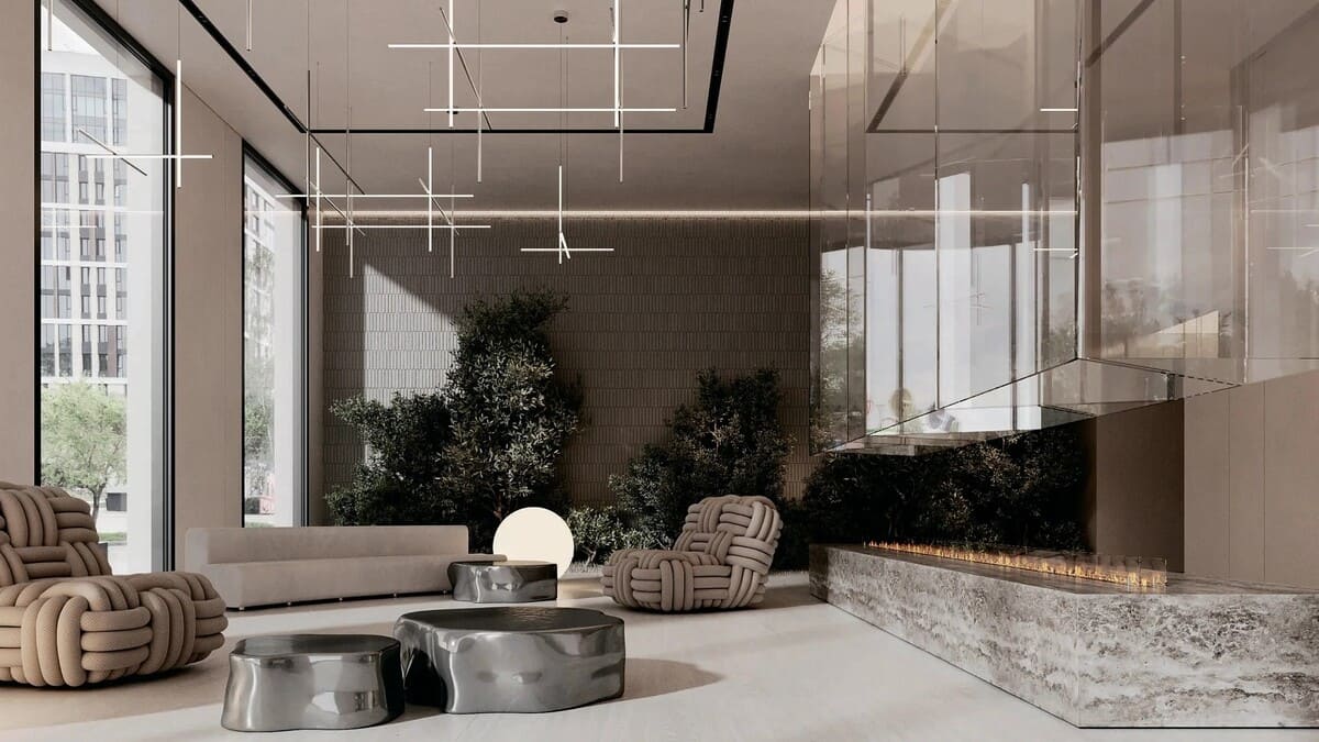 Лобби с высотой потолков 7,8 метра встречает гостей роскошной зоной ресепшн, мягкой lounge-зоной и декоративным камином.