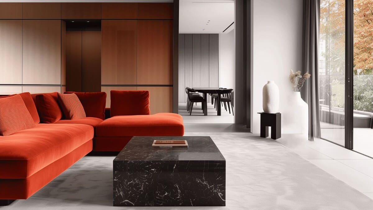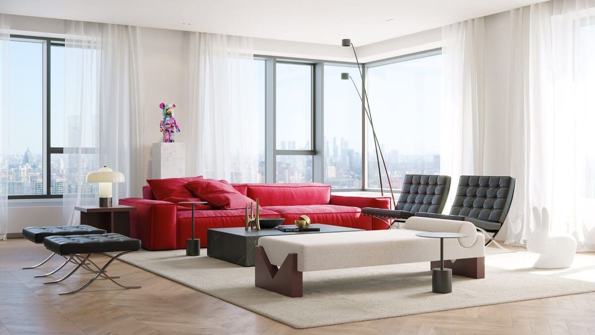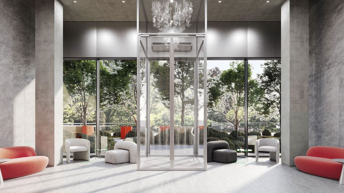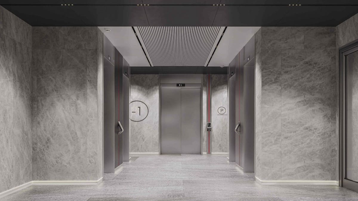 Лобби выдержаны в эстетике индустриального минимализма: бетонные стены, выразительные красные акценты, высокие потолки до 6 метров и панорамные окна наполняют пространство светом и объемом.