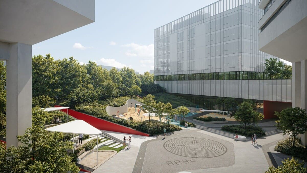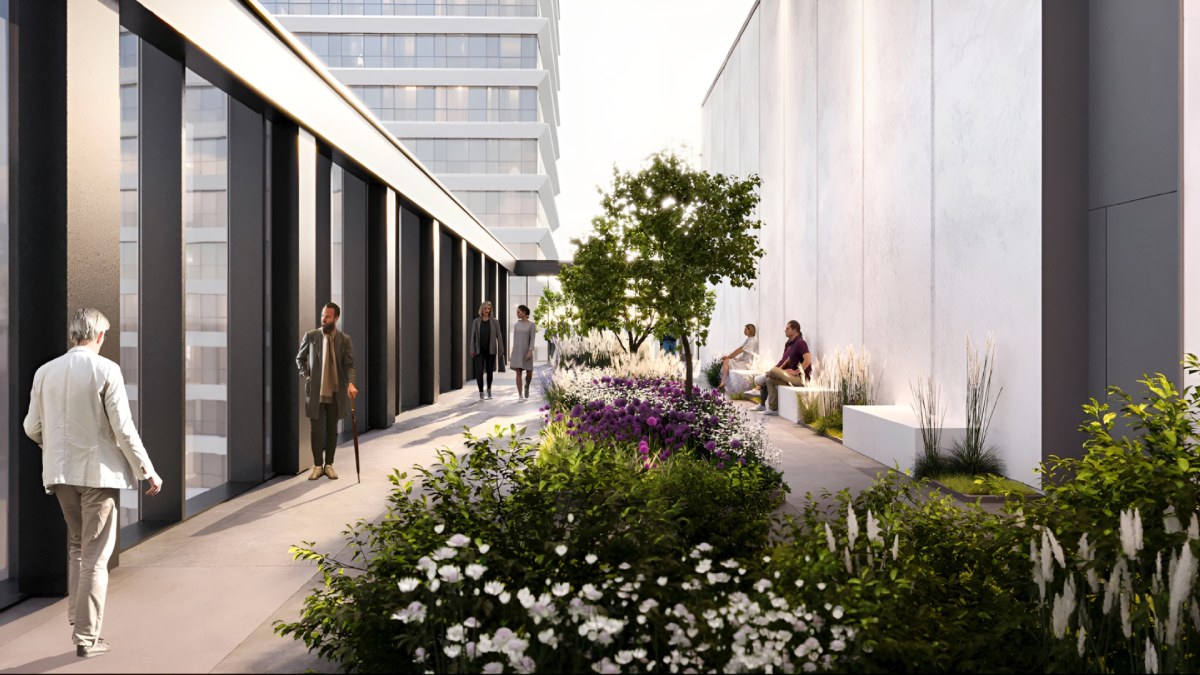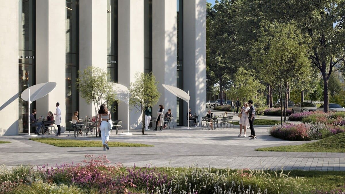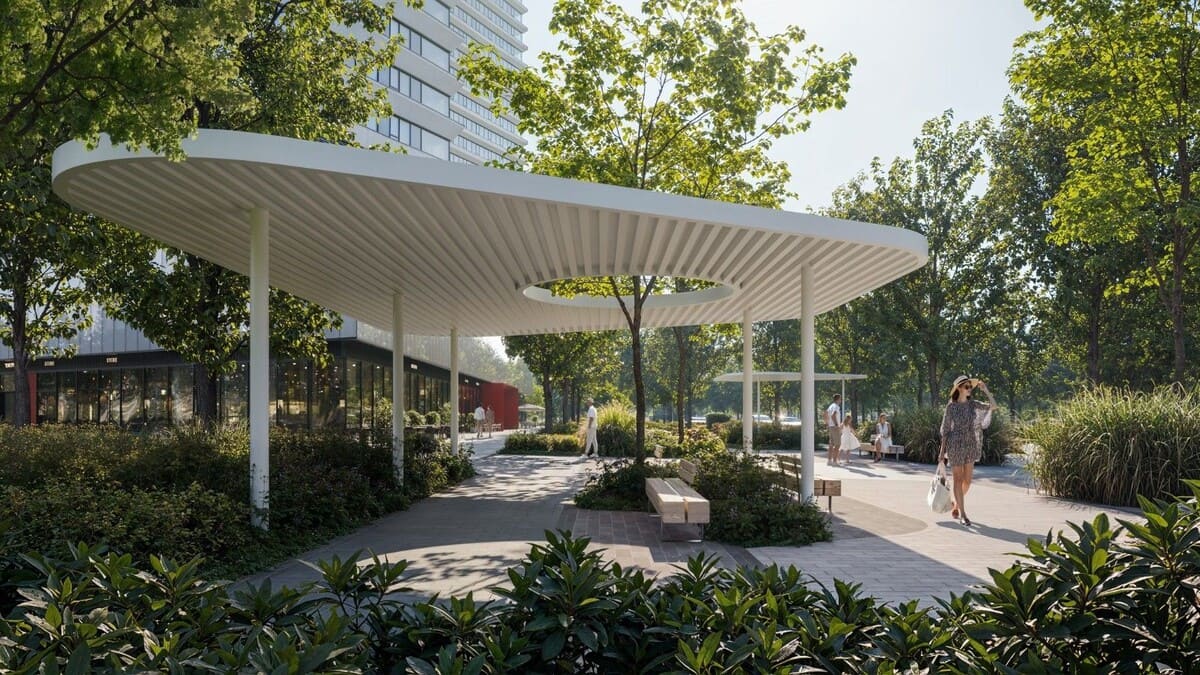 Комплекс объединён одноэтажным стилобатом, кровля которого служит вторым приватным уровнем: это озеленённая терраса с зонами отдыха и уединения. Здесь расположены мини-гольф, амфитеатр с навесом для культурных событий, площадка для йоги и тренировки на свежем воздухе.
