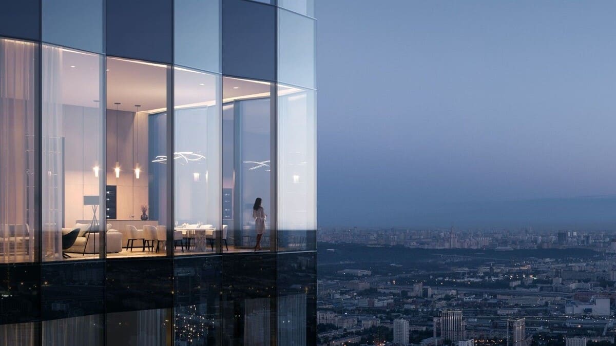 На 40 и 41 этажах расположены пентхаусы – по три на каждом уровне. Высота потолков достигает 4,5 метров, а площадь – до 152 м².