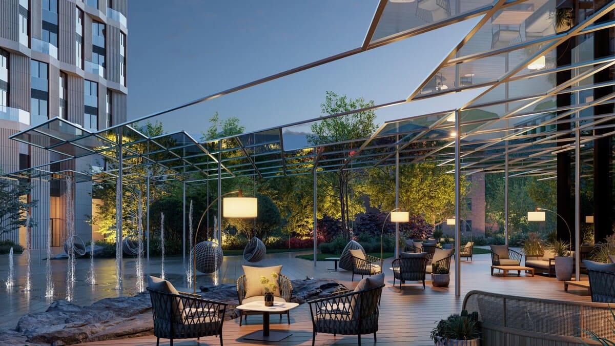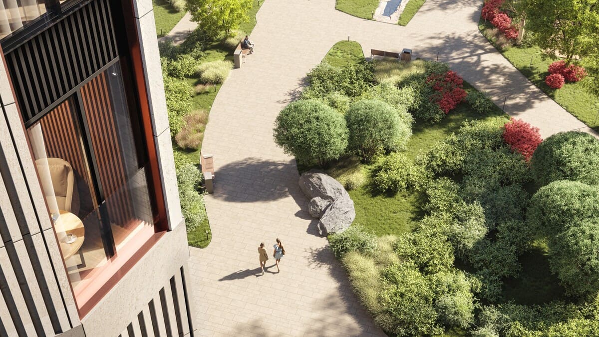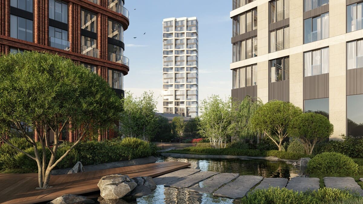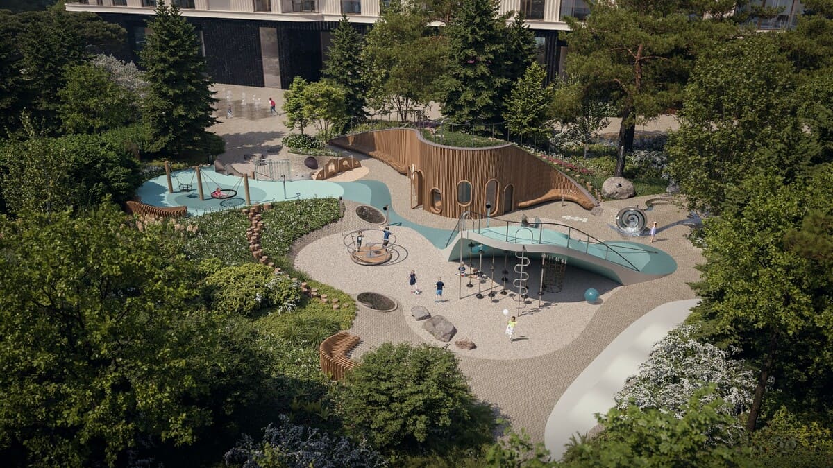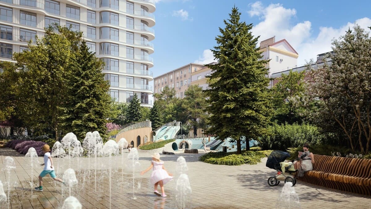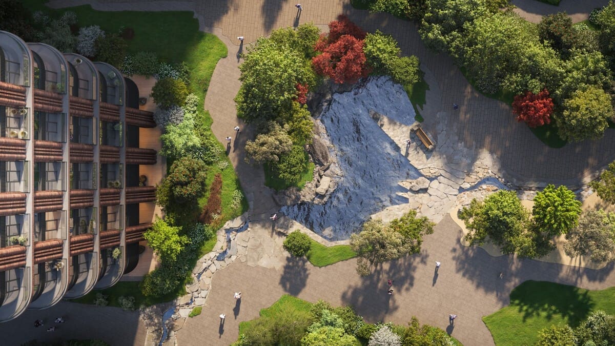 В ландшафтной концепции предусмотрено всё: от фонтанов и ручьев до приватных садов, террас и спортивных зон. Здесь есть летняя терраса, два декоративных пруда (в том числе каскадный с парящей террасой), амфитеатр, зоны йоги, воркаута и игр, а также уютные уголки для медитации и чтения.