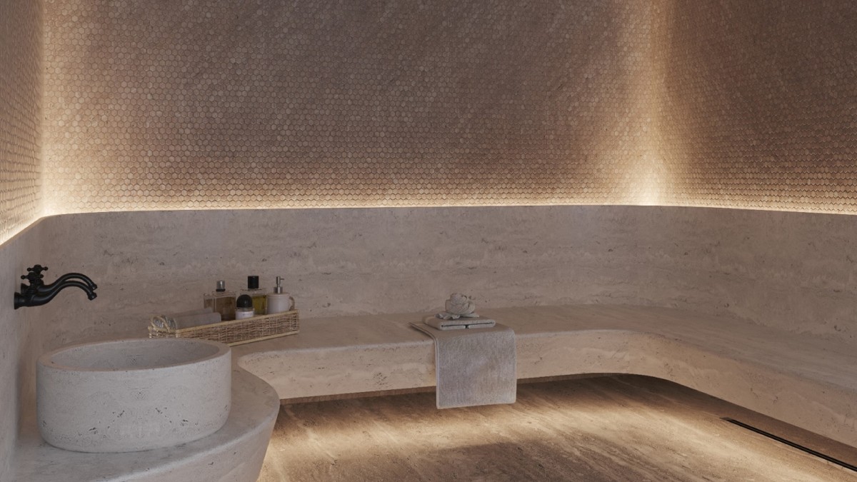 Интерьеры оформлены с применением натурального камня, цветного и градиентного стекла, металла – материалов, задающих фактурную глубину и визуальную насыщенность пространства.